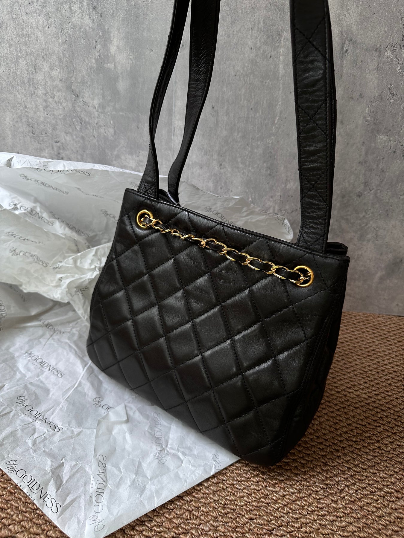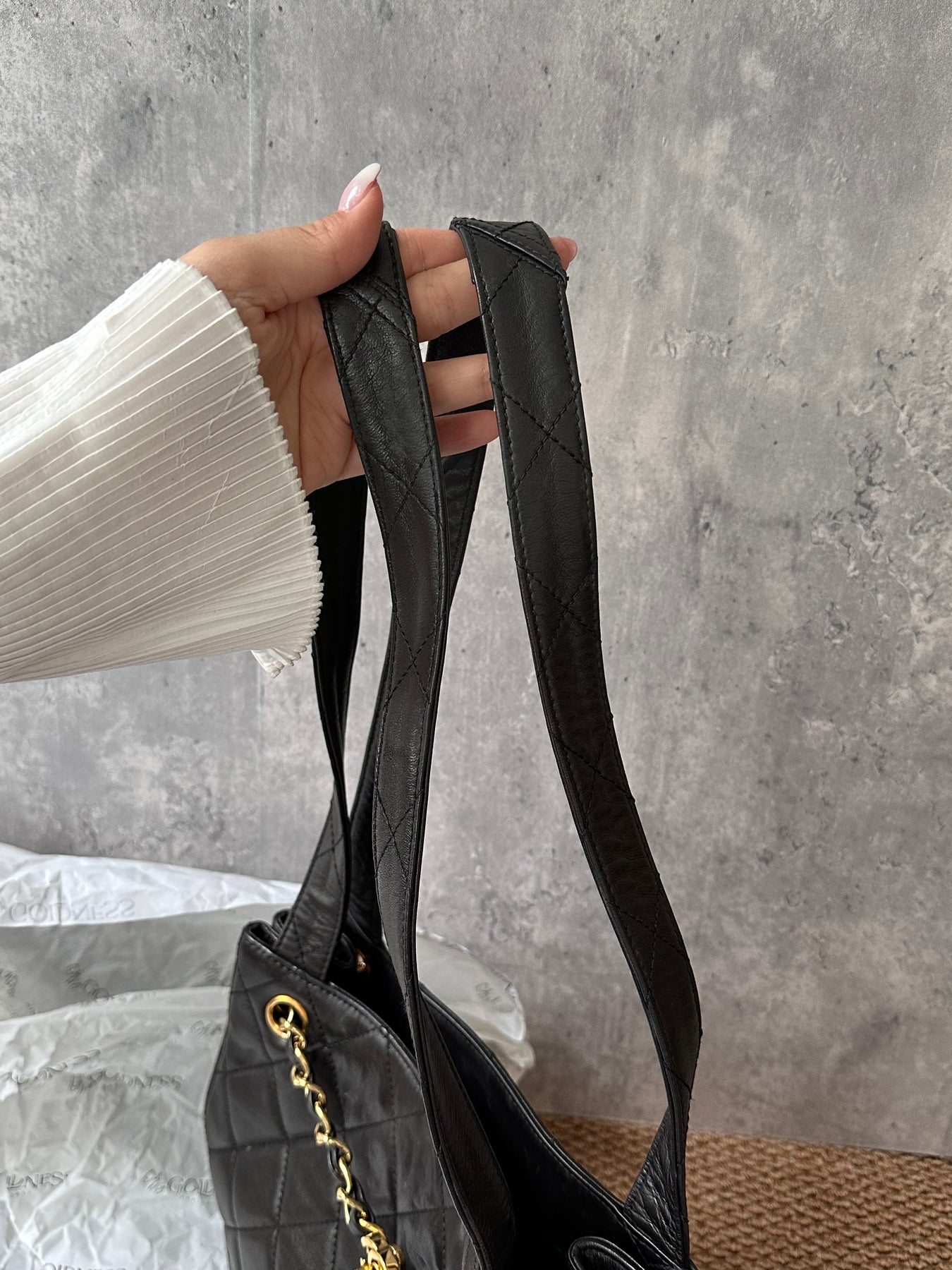 A rare vintage treasure from CHANEL, this shoulder bag features an elegant drawstring closure with leather-woven chain, secured by a stunning gold-tone turnlock clasp – a design seldom seen and rich in retro CHANEL character.