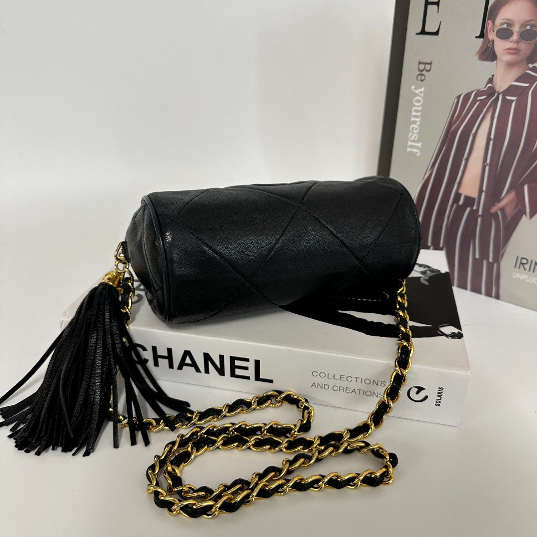This adorable mini Boston bag from Chanel features the iconic quilted leather with a bold CC logo at the front. Paired with a beautifully crafted leather-woven chain strap, it delivers classic Chanel elegance in a compact, playful size.