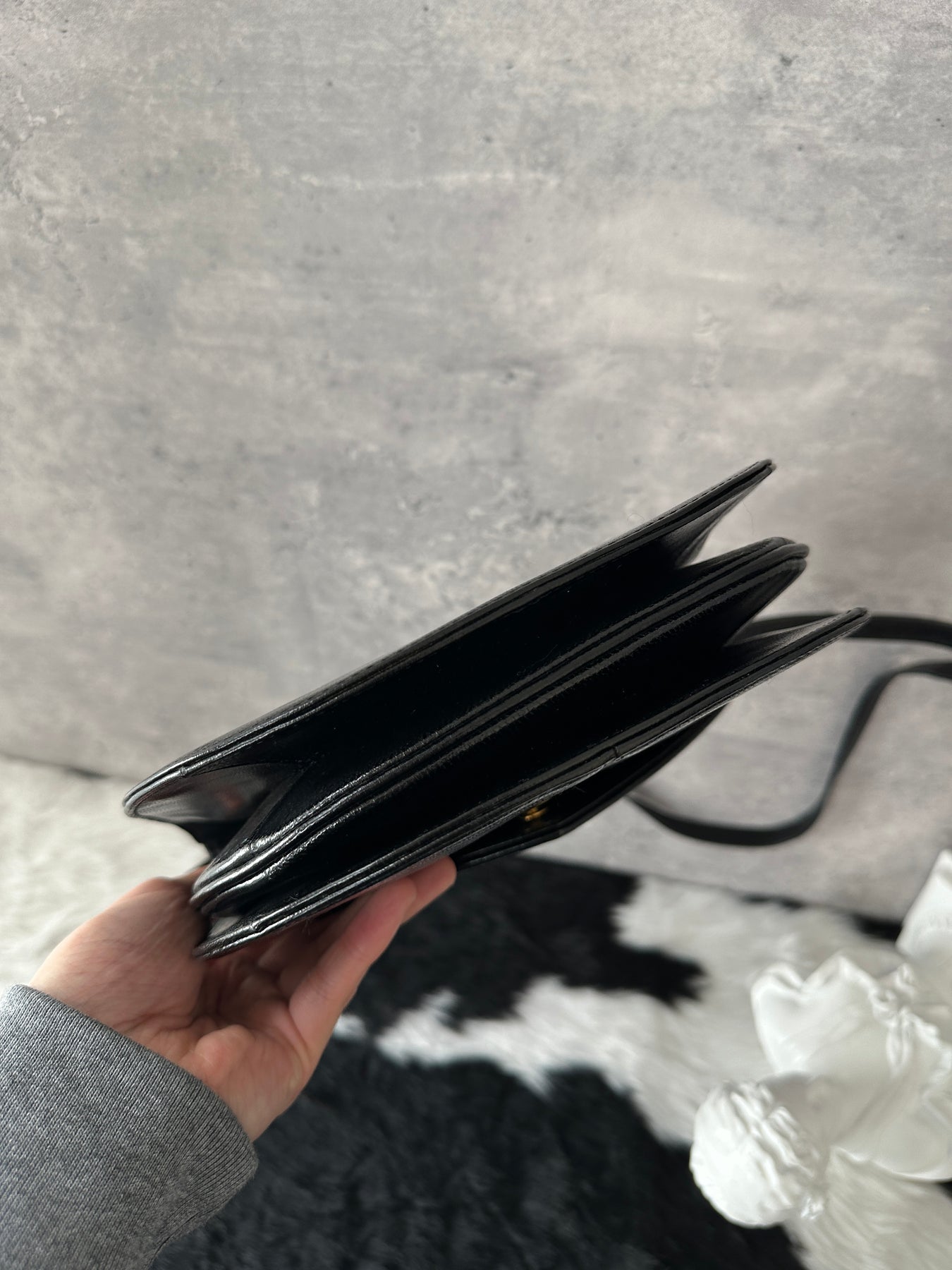 Compact yet thoughtfully designed, the bag opens to reveal an interior adorned with all-over YSL monogram lining, adding a subtle signature touch. Lightweight and easy to carry, this piece embodies classic Saint Laurent sophistication with a strong collector’s appeal.