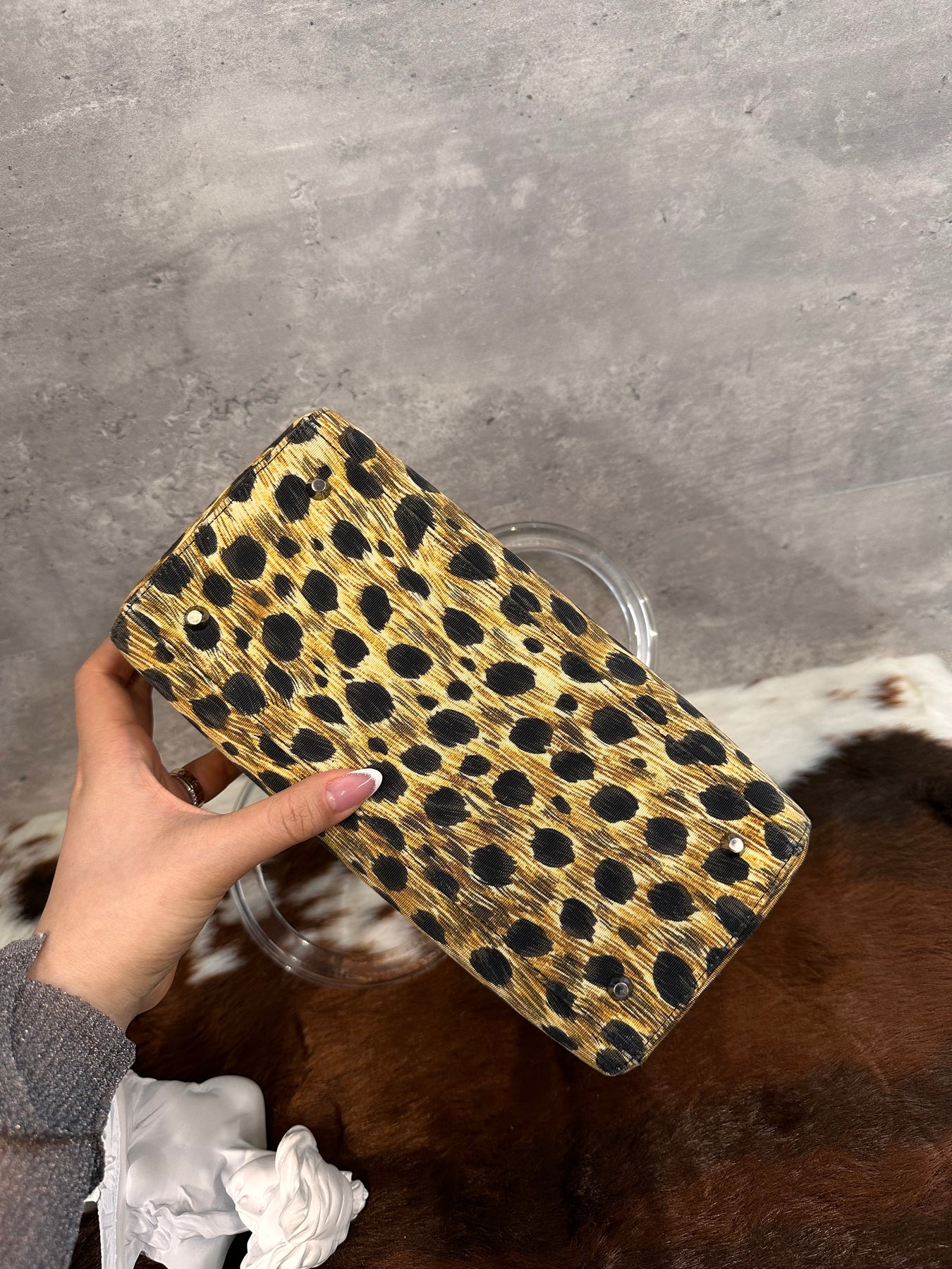 A beautifully preserved Lady Dior featuring a striking leopard-print fabric that instantly stands out. Paired with elegant lucite (glass-like) handles, this rare combination brings a bold yet refined character to the classic Dior silhouette.