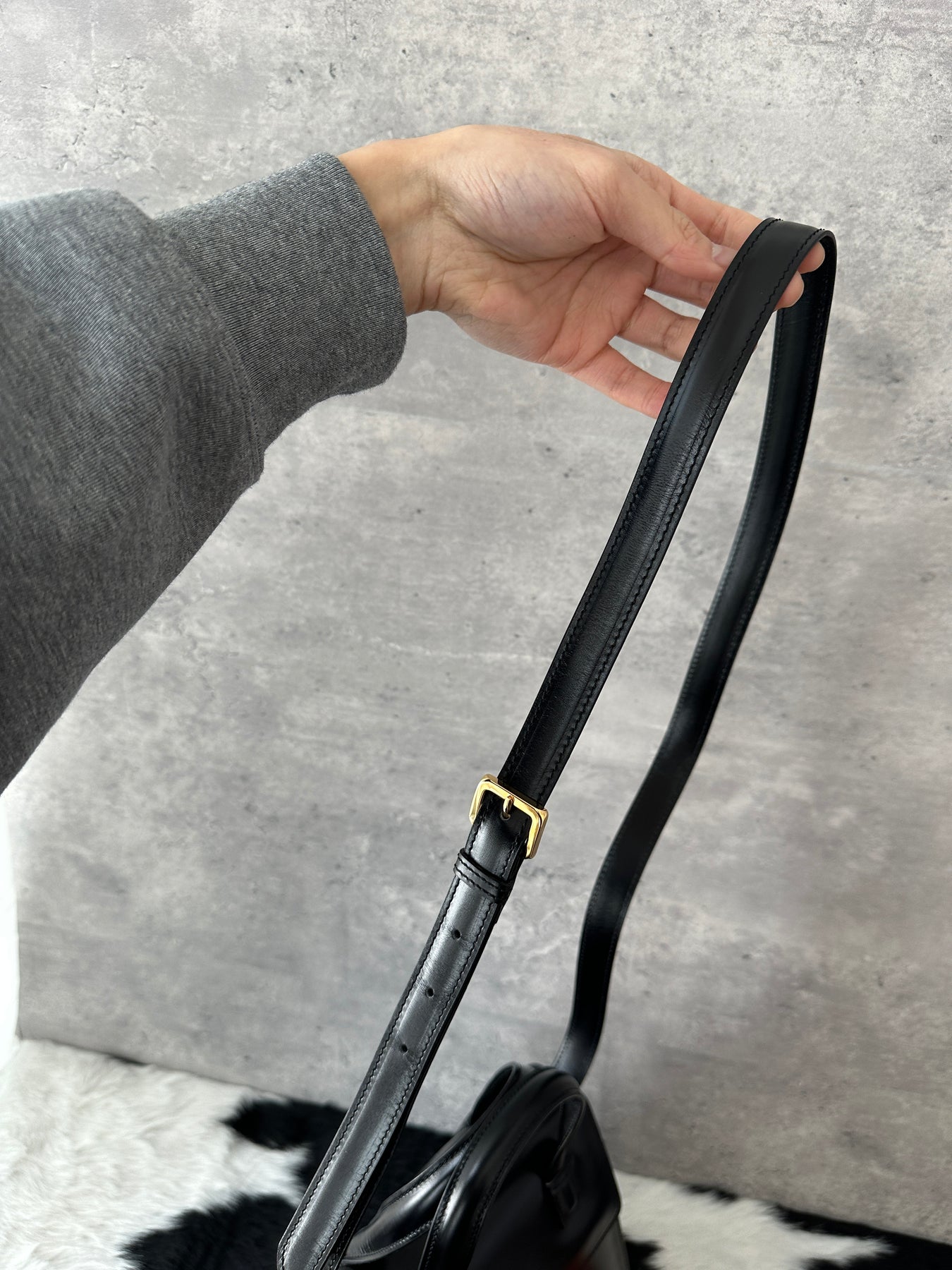 Its compact yet structured silhouette is paired with the original shoulder strap, allowing for both handheld and crossbody wear. Practical in size while effortlessly chic, this piece transitions seamlessly from daily styling to more polished occasions.