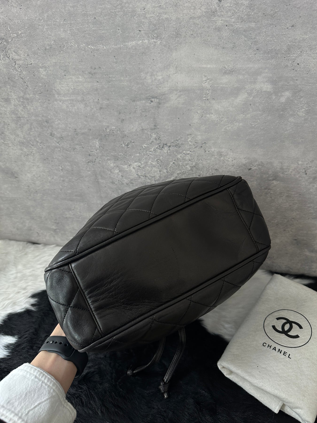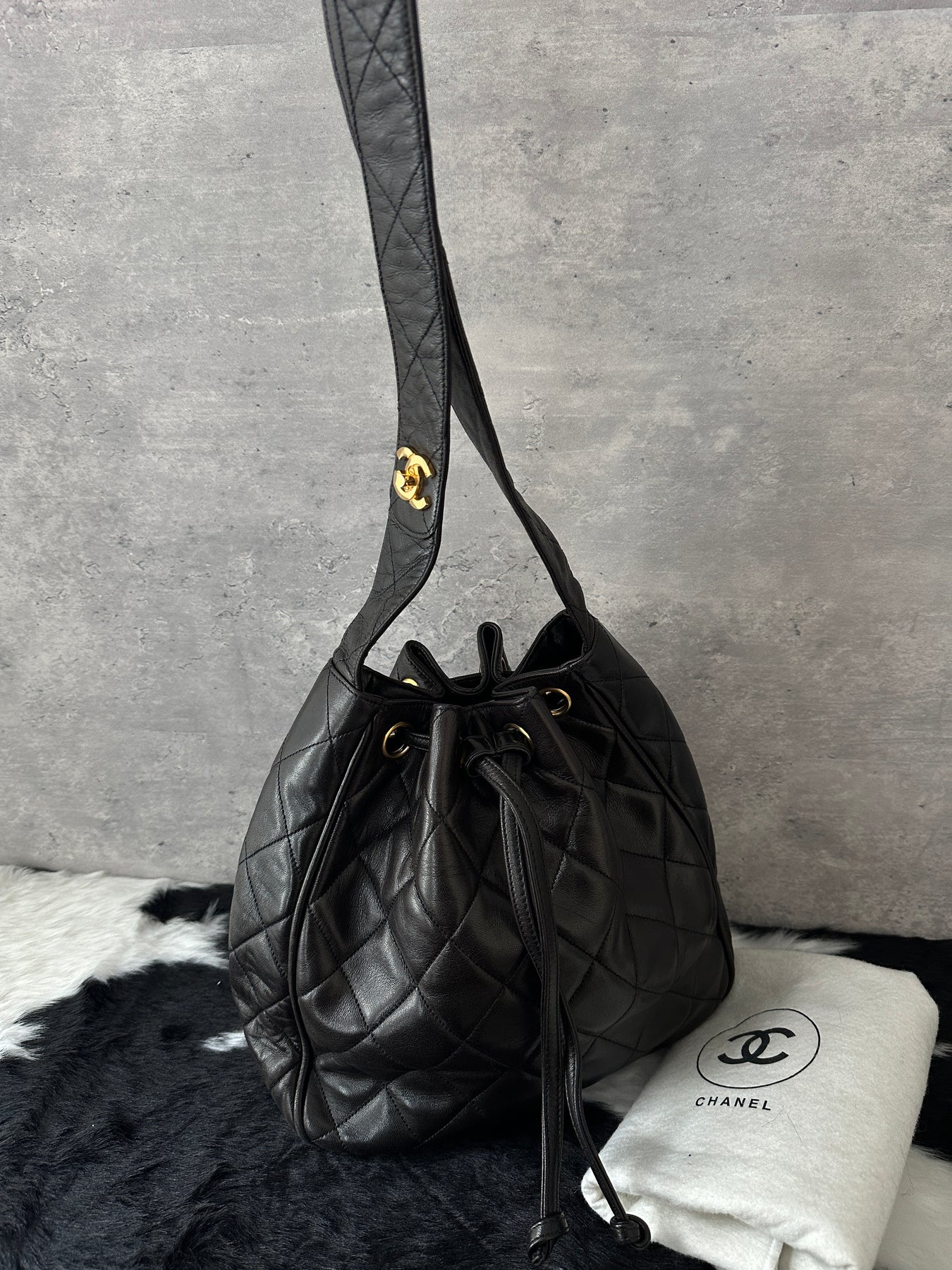 A beautifully preserved Chanel bucket bag featuring the iconic CC turn-lock detail and elegant drawstring design. Crafted in classic black leather with gold-tone hardware, this rare silhouette captures the essence of vintage Chanel—effortlessly chic with enduring charm.