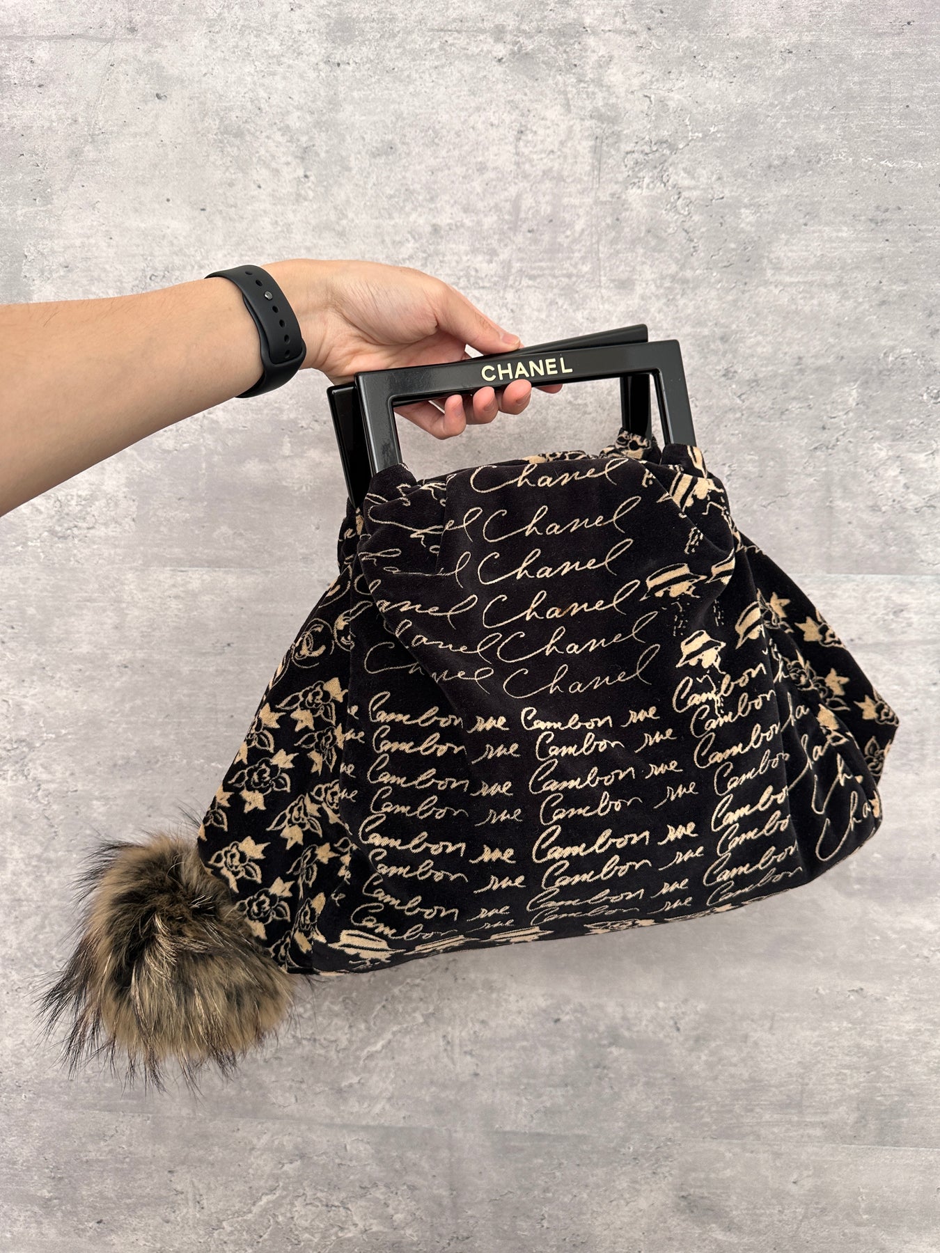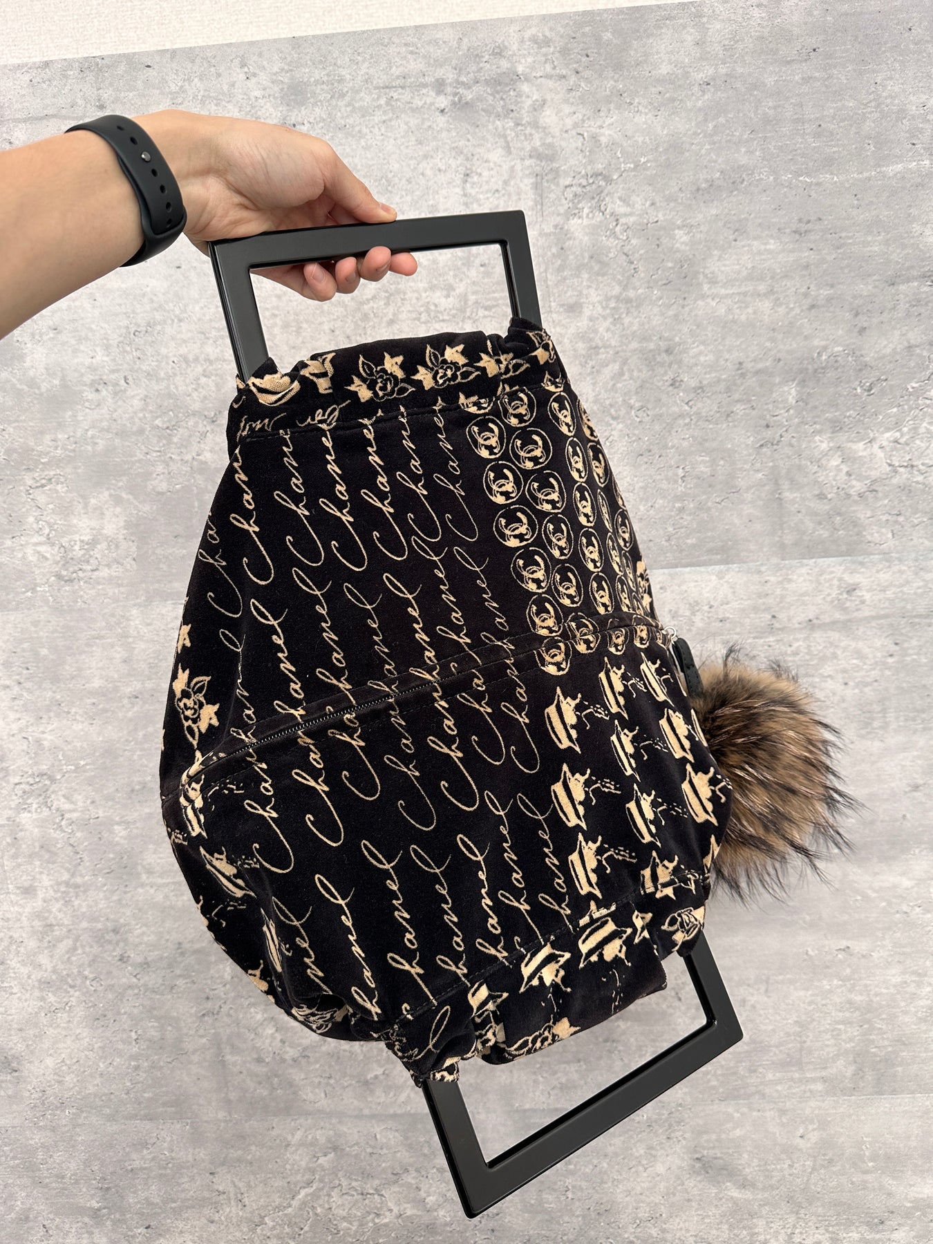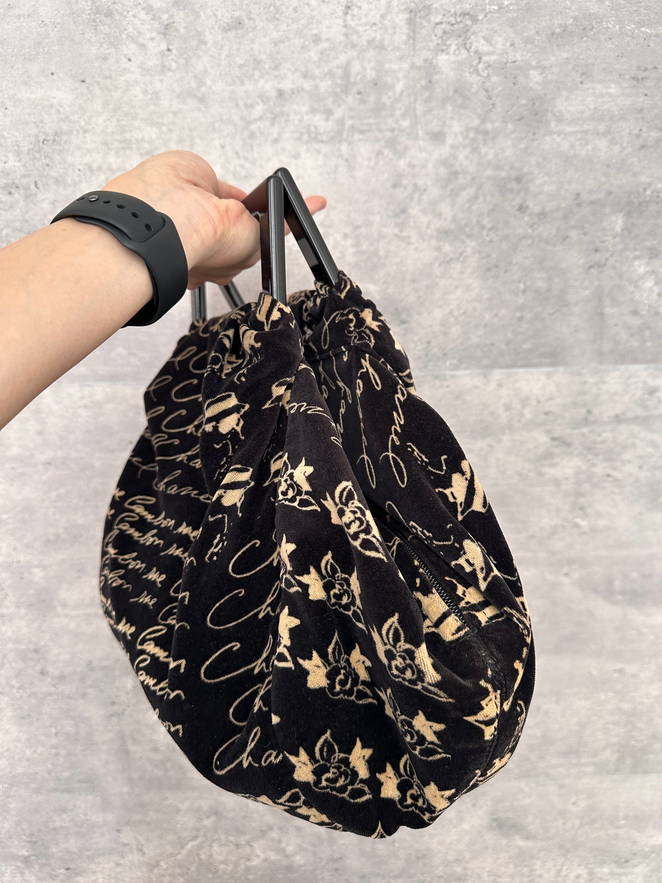 A rare Chanel velvet handbag featuring a soft, slouchy silhouette that exudes a cozy, relaxed charm. The bag is detailed with script-style Chanel logos and motifs across the fabric, plus a playful bunny-tail zipper pull that adds a whimsical touch. Comes with authenticity card & sticker, this is a true collector’s special edition piece that you won’t come across easily!