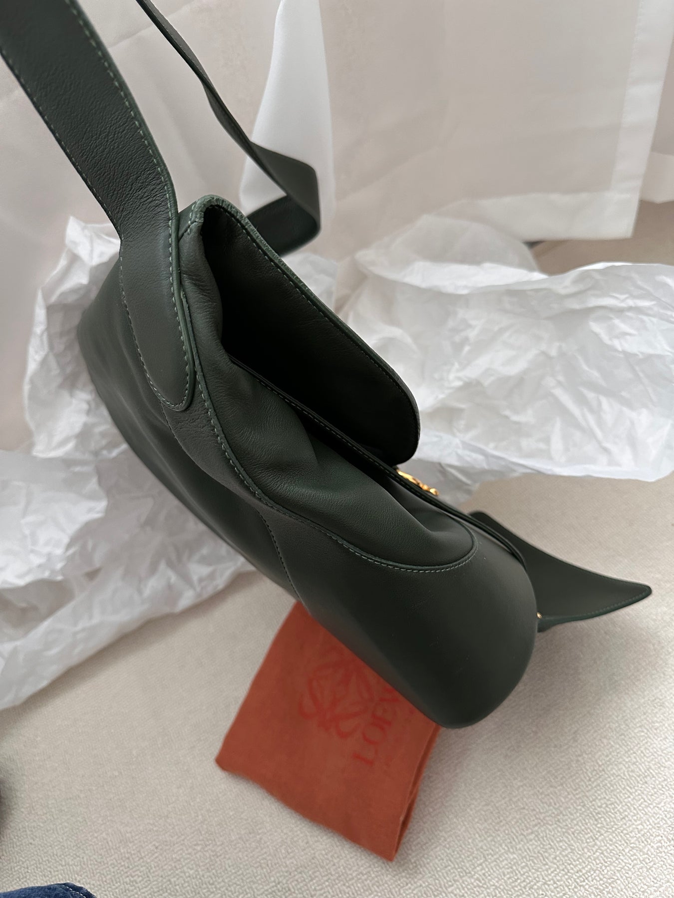 “An olive green Loewe hobo with pouch is hard to find — the shade is refined, versatile, and adds a chic touch to any look!”