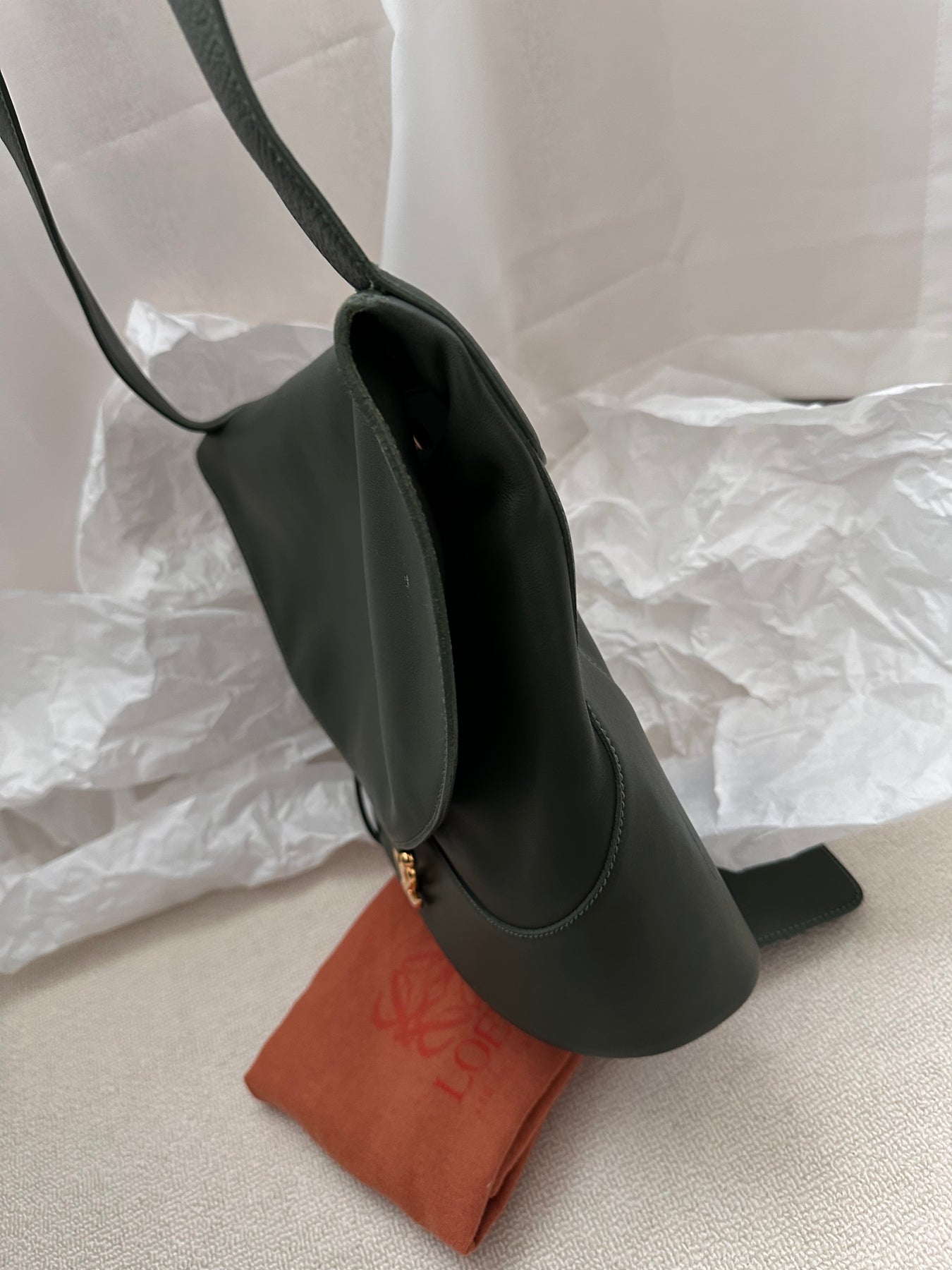 罕有又高級的 Loewe flap hobo,以牛皮打造,優雅橄欖綠色調,展現慵懶隨性的雲朵感輪廓。