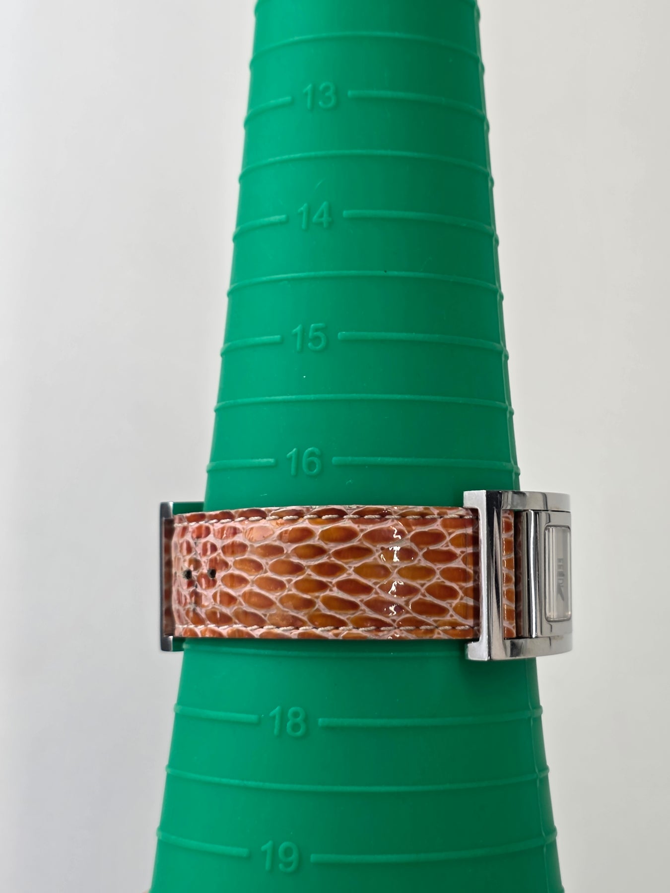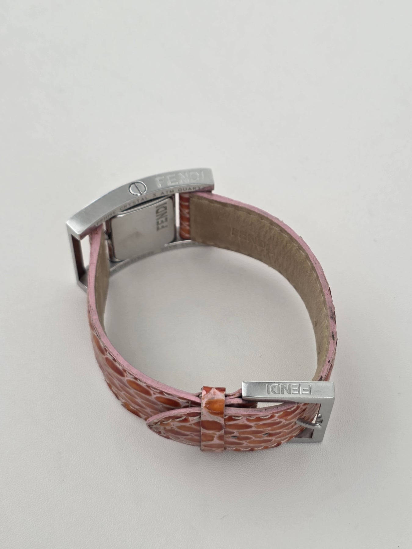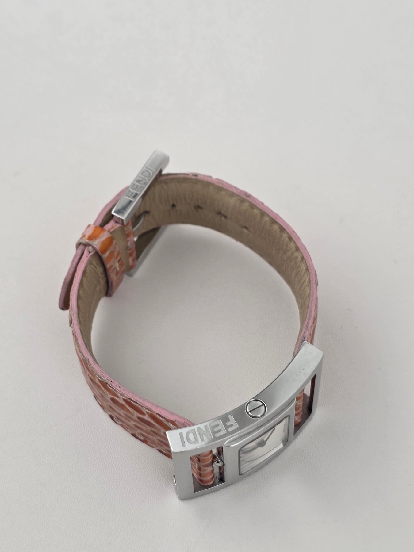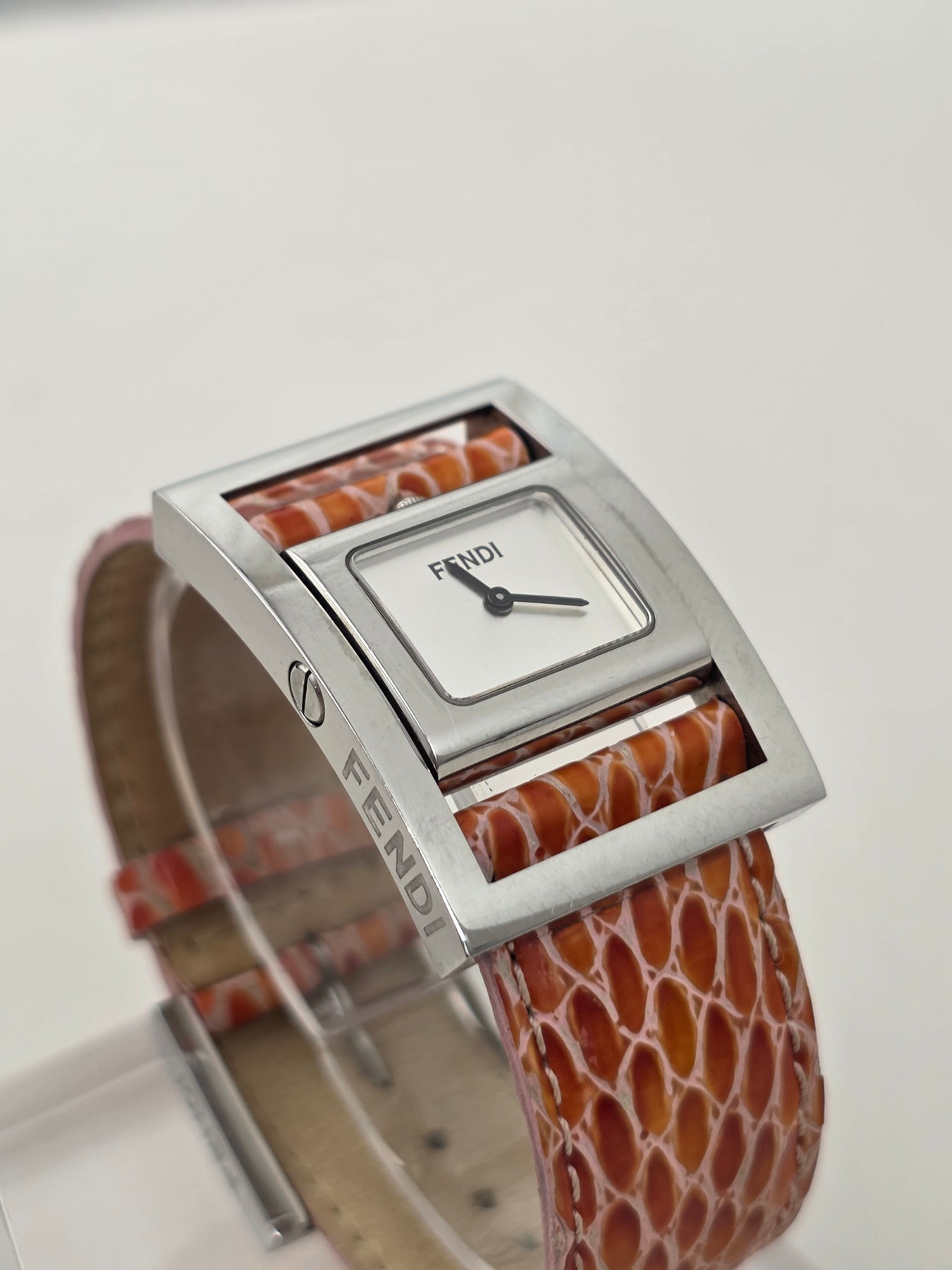 A unique vintage Fendi watch featuring a distinctive flip-over case design, allowing the watch face to be concealed and protected when not in use. The clean square dial offers a minimalist and refined look, contrasted by the structured case frame.