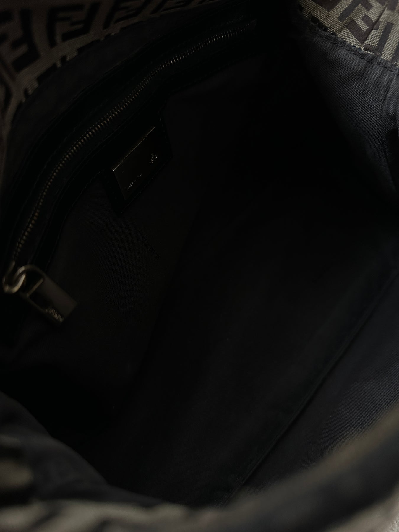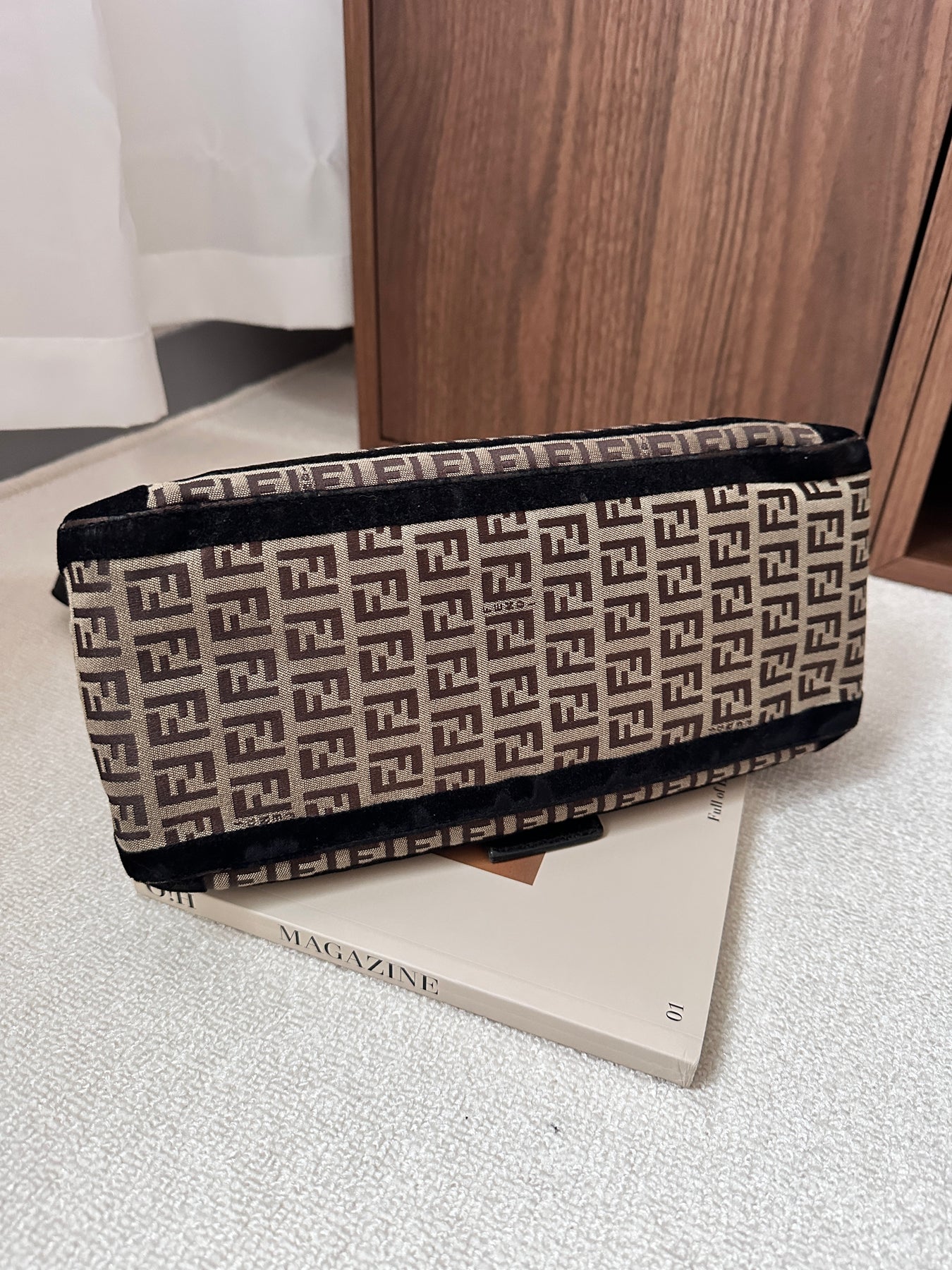 A stunning and rare Fendi Mamaa bag featuring the iconic FF monogram canvas with luxurious velvet trim details. The soft velvet edging adds a unique texture contrast, while the gold-tone buckle elevates this piece into a truly collectible find.