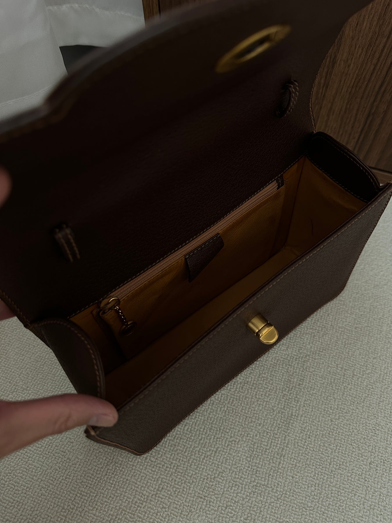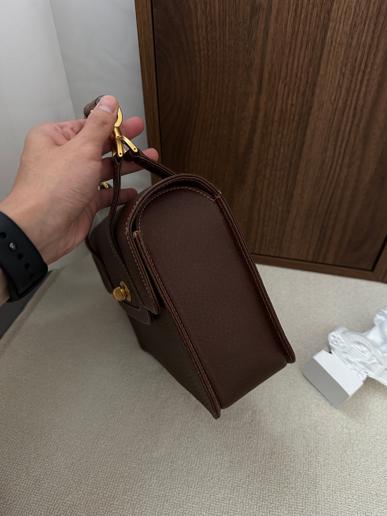 This piece features durable pigskin leather in a rich chocolate brown tone—renowned for its toughness and longevity—combined with gleaming gold-tone hardware. Its structured silhouette and double-handle design offer a timeless elegance. Perfect for carrying by hand, and it can be paired with a strap for crossbody styling.