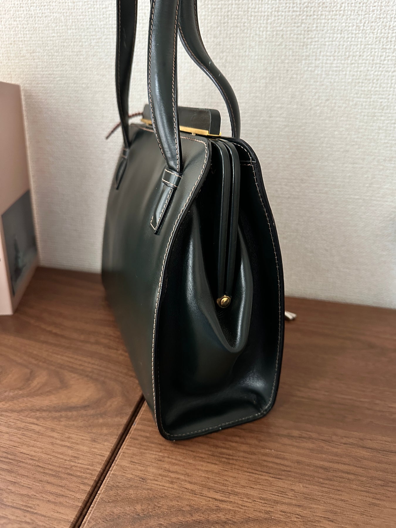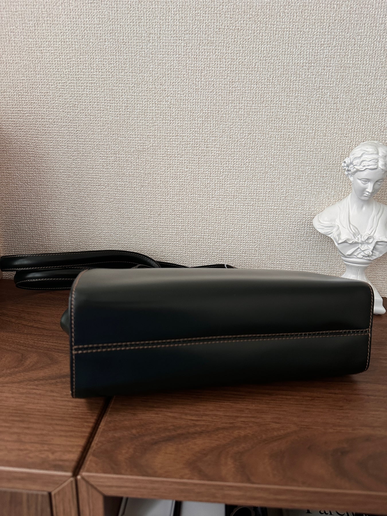 絕美的 LOEWE 墨綠 box 皮肩背包,顏色在不同光線下幾乎呈現黑色,但近看能感受到低調又獨特的深綠色調。中間的金屬條開口設計,高級感滿滿。