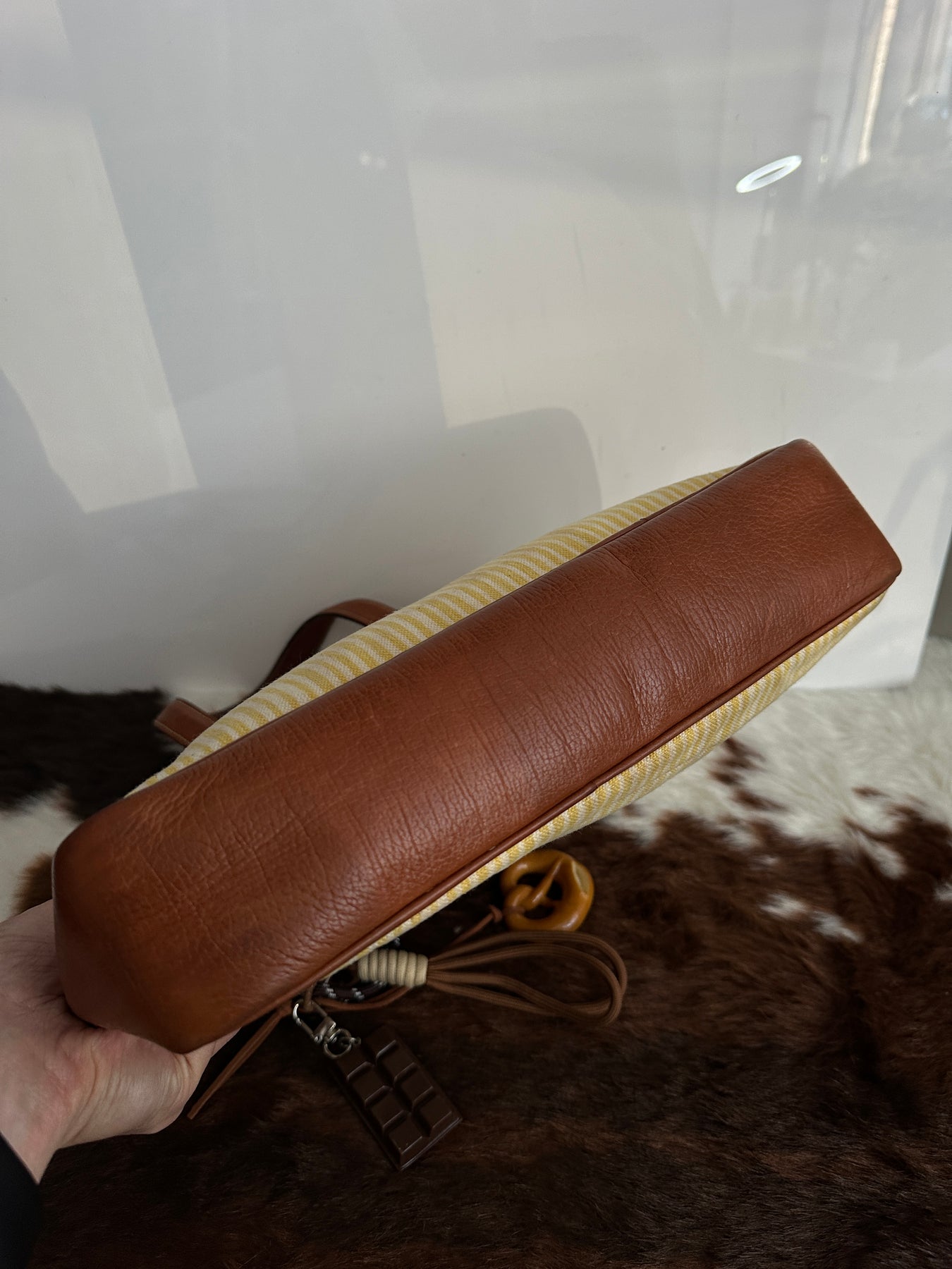 奶黃白條紋布面拼上焦糖皮革,色調溫柔又有層次~