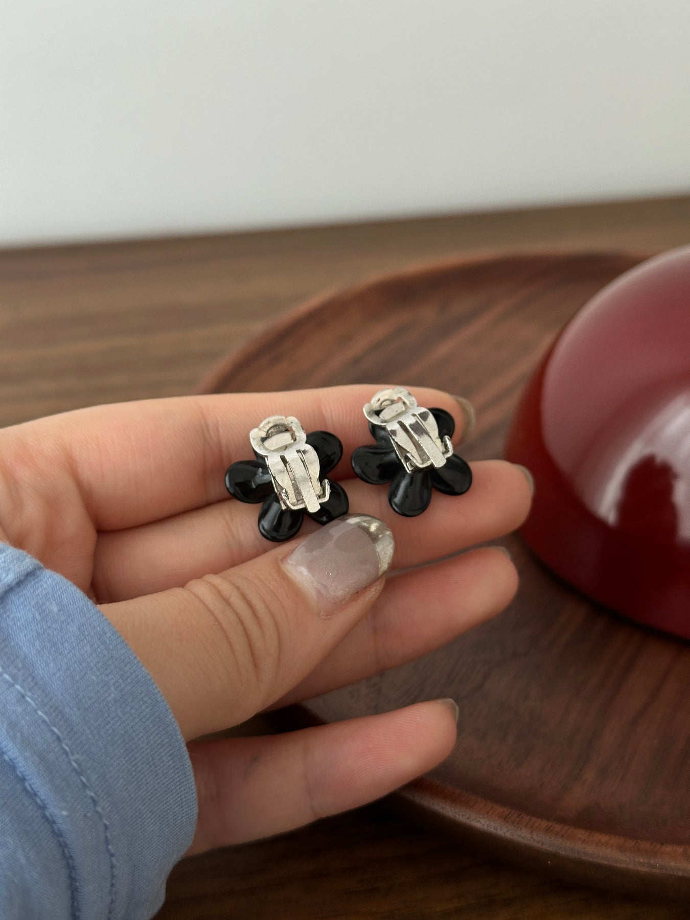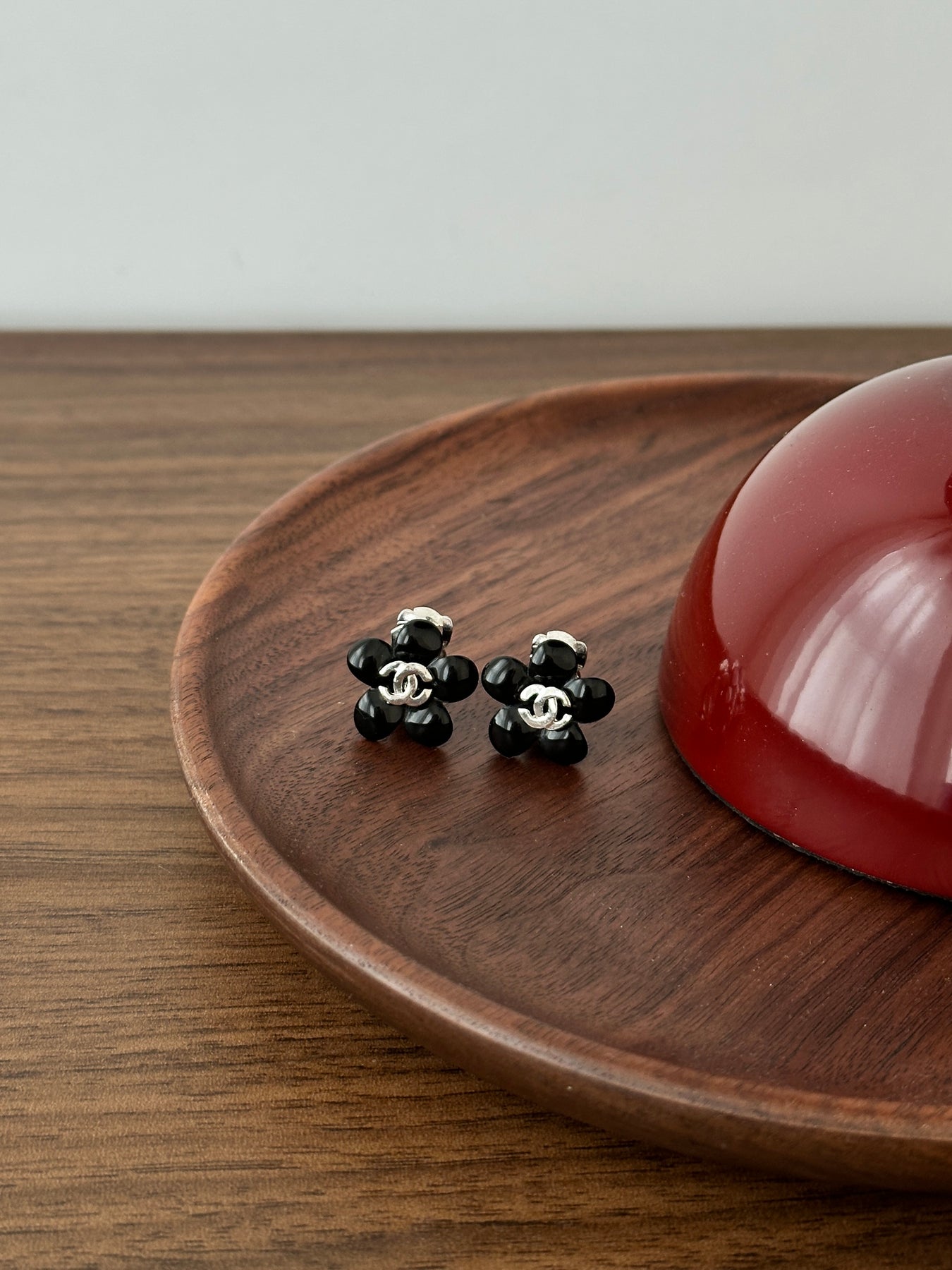 CHANEL Black Camellia Stud Earrings – Glossy Petals × Silver CC Center × Chic & Playful✨