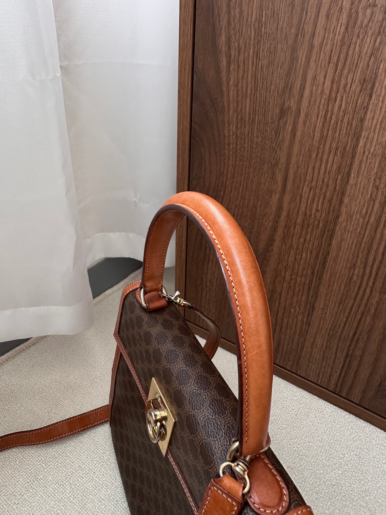 超罕有的 Celine Kelly 風格手提包,經典 老花 Macadam monogram 配上溫潤棕色皮革滾邊,還有亮眼的 金色Kelly釦,完全展現了 Celine 般的高雅氣質和復古的韻味。