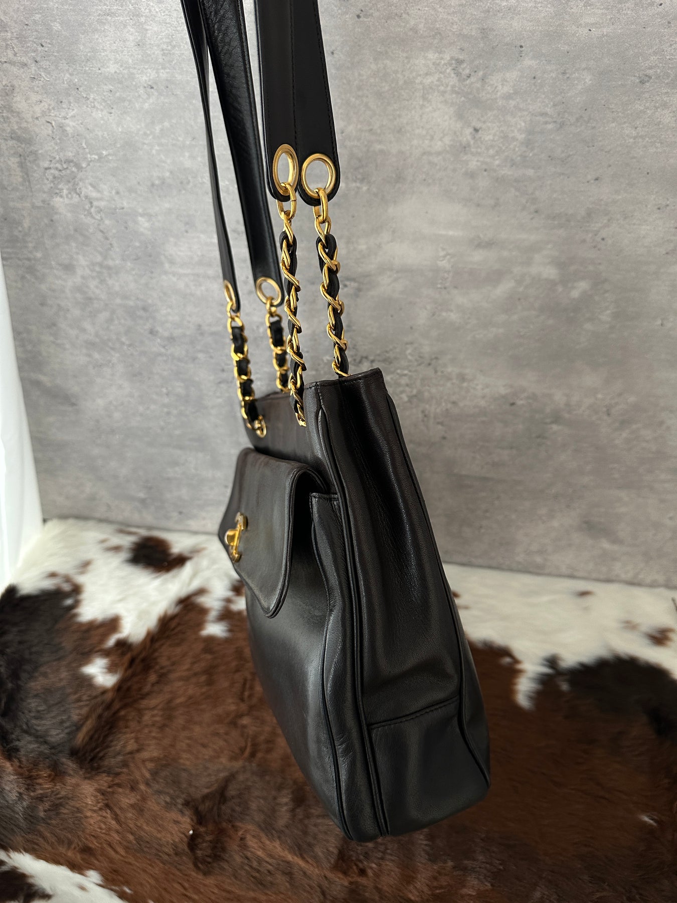 A beautifully structured Chanel shoulder tote featuring a classic gold CC turn lock on the front — and an additional CC logo on the back, making it iconic from every angle.