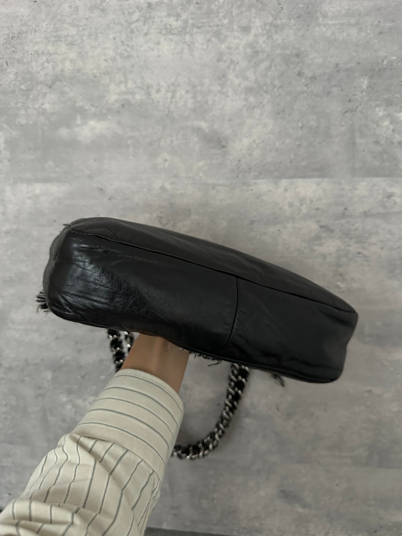An OMG-level discovery — this Chanel oil-waxed calfskin shoulder bag with shearling trim is one of the cutest and rarest vintage gems out there 😻 Crafted from soft glazed calfskin, it exudes a subtle shine and luxurious texture. The playful wool trim gives it a cozy yet chic look, perfectly balanced by the silver-tone CC clasp and unique tweed-style chain strap.