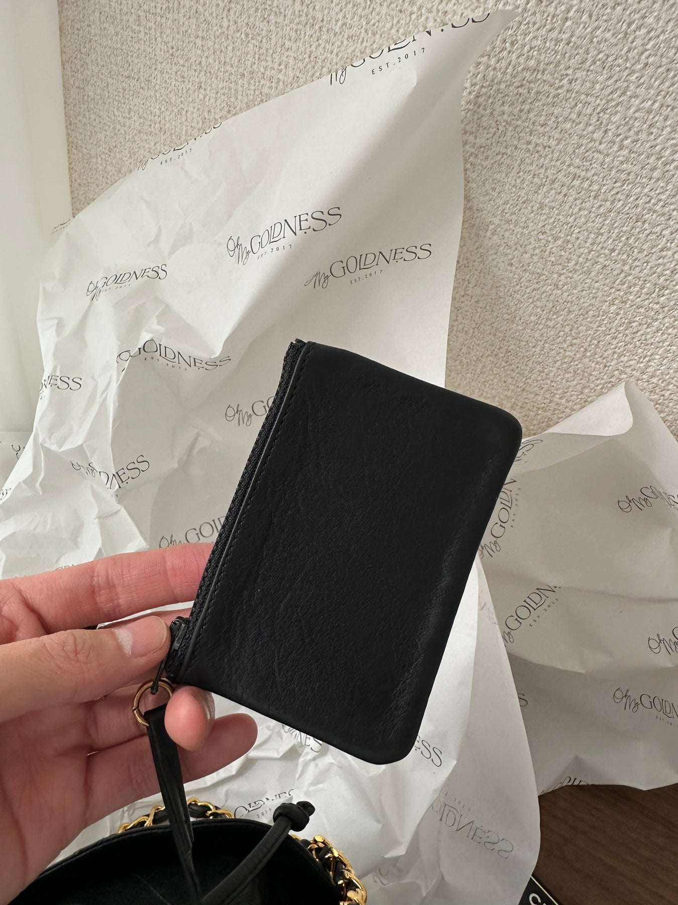 The drawstring design gives it that effortless, relaxed feel, while the shiny gold chain interlaced with leather provides versatility — wear it crossbody or over the shoulder with equal grace. Inside, it’s compact yet surprisingly roomy, perfect for carrying your essentials like a phone, wallet, and lipstick💋.