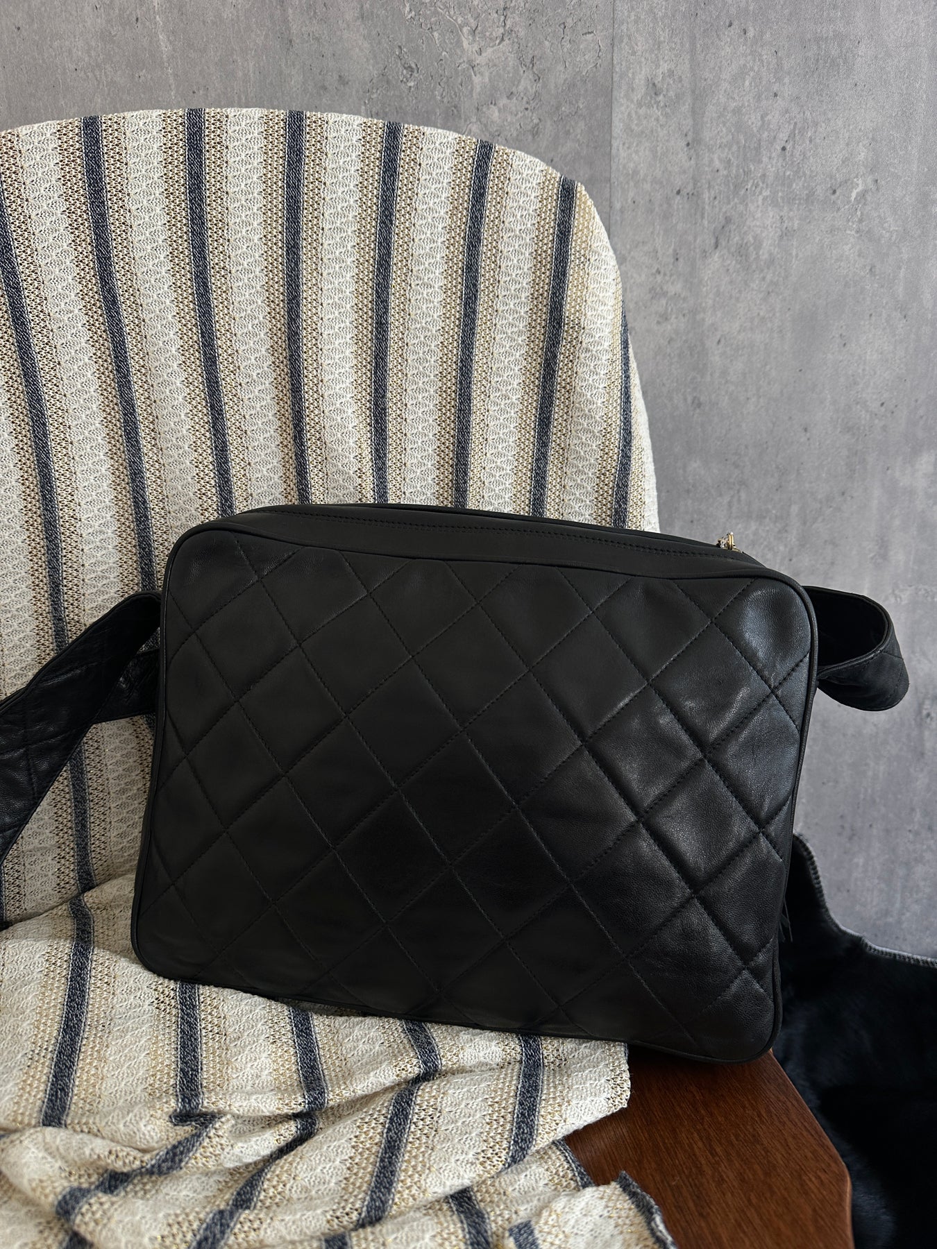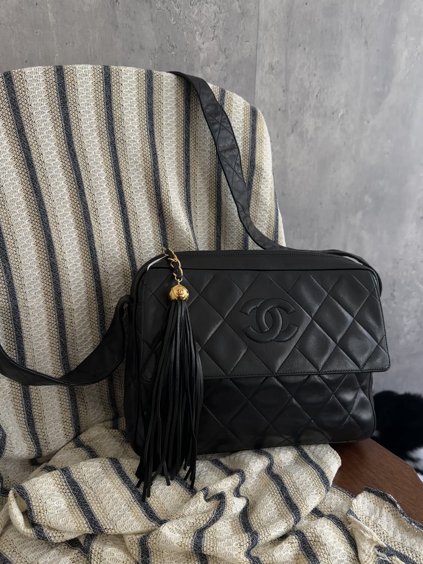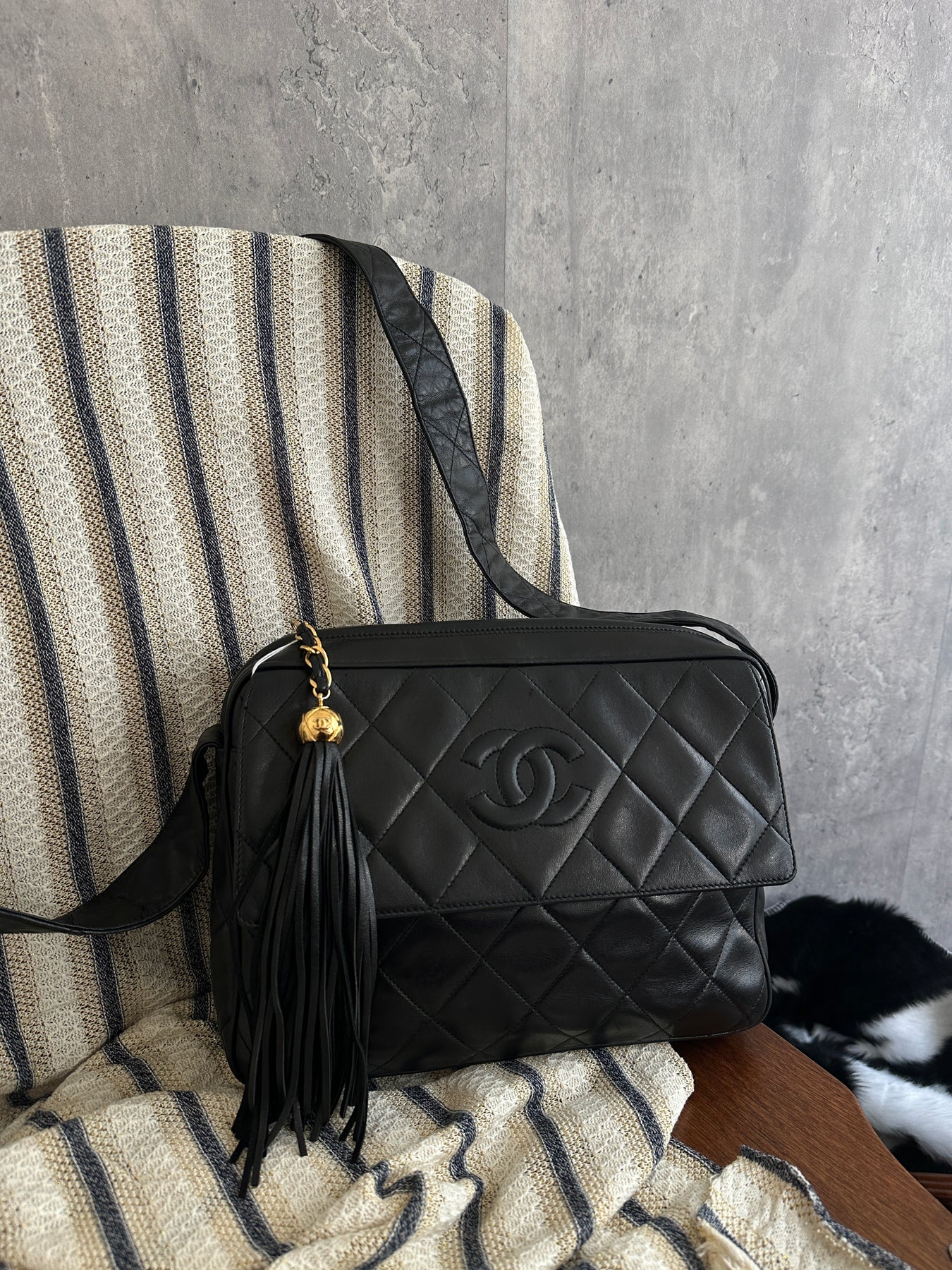 A timeless vintage Chanel crossbody crafted in classic quilted lambskin leather, finished with the iconic gold ball tassel detail.