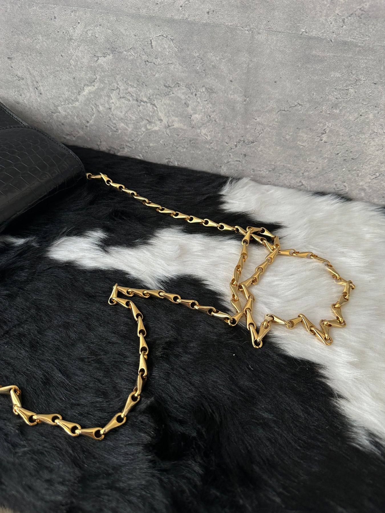 Lightweight yet striking, this bag is paired with a rare gold fishbone chain, adding sculptural elegance and vintage character. A design that combines statement hardware with exceptional materials—extraordinarily hard to come by in this condition.