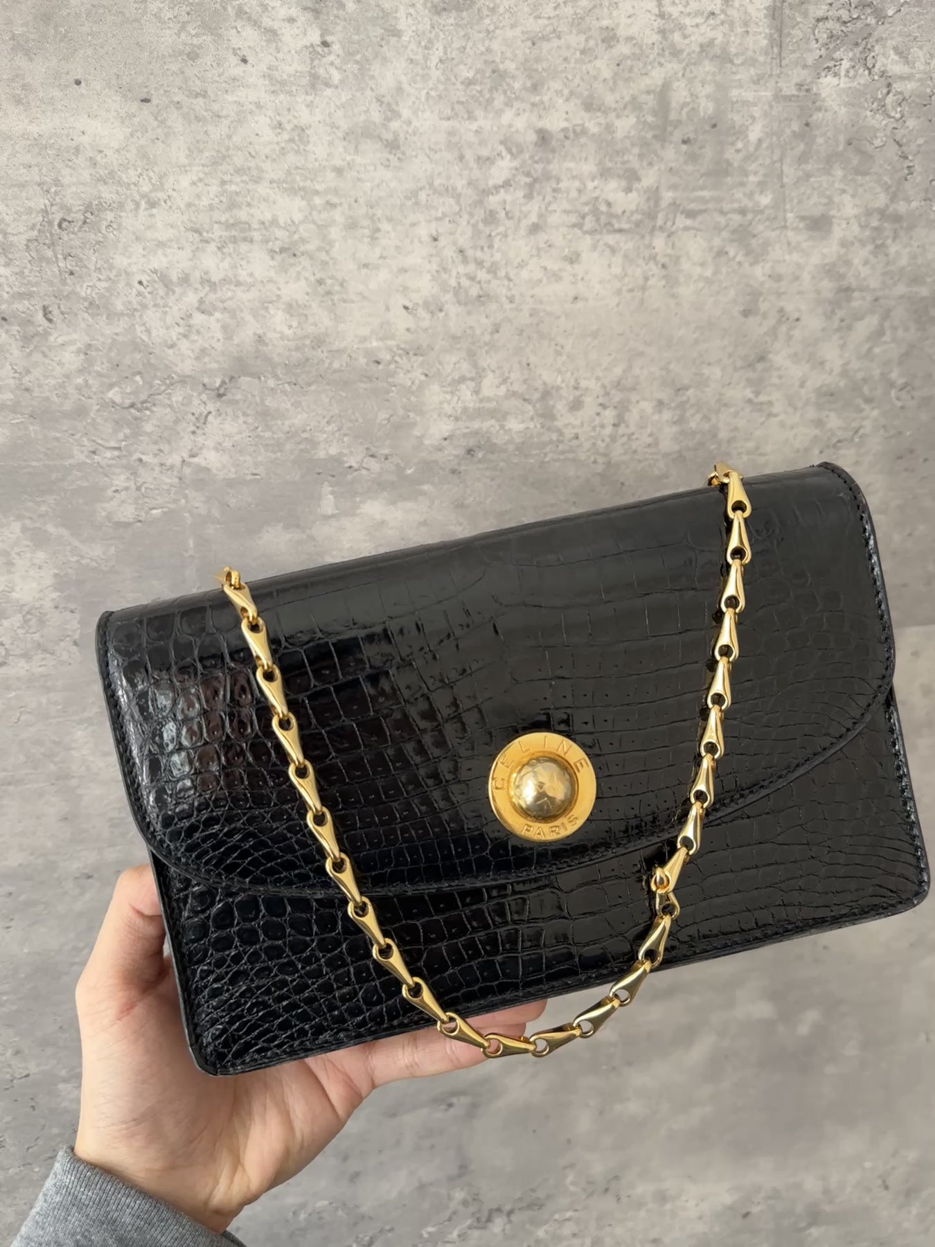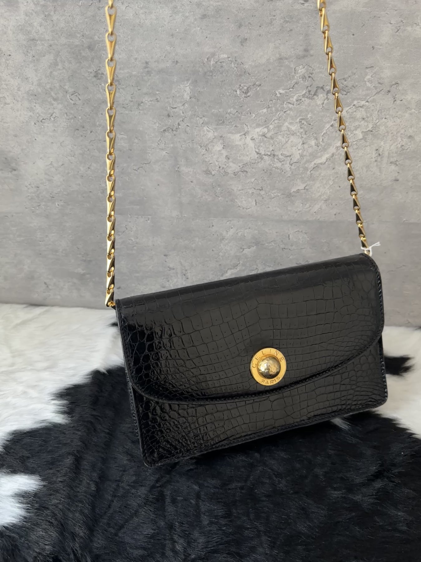 A beautifully preserved Celine crossbody crafted from glossy crocodile leather, featuring the iconic planet lock that instantly elevates the design into a true collector’s piece. The deep black exotic leather reflects light subtly, highlighting the natural texture and luxurious finish.