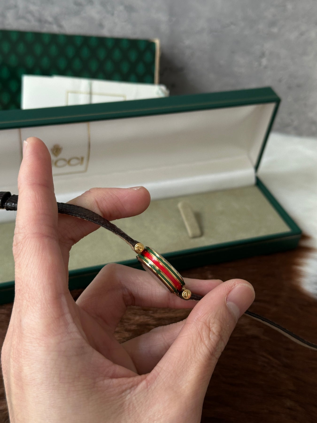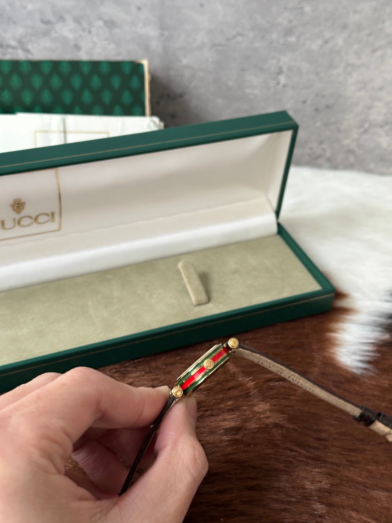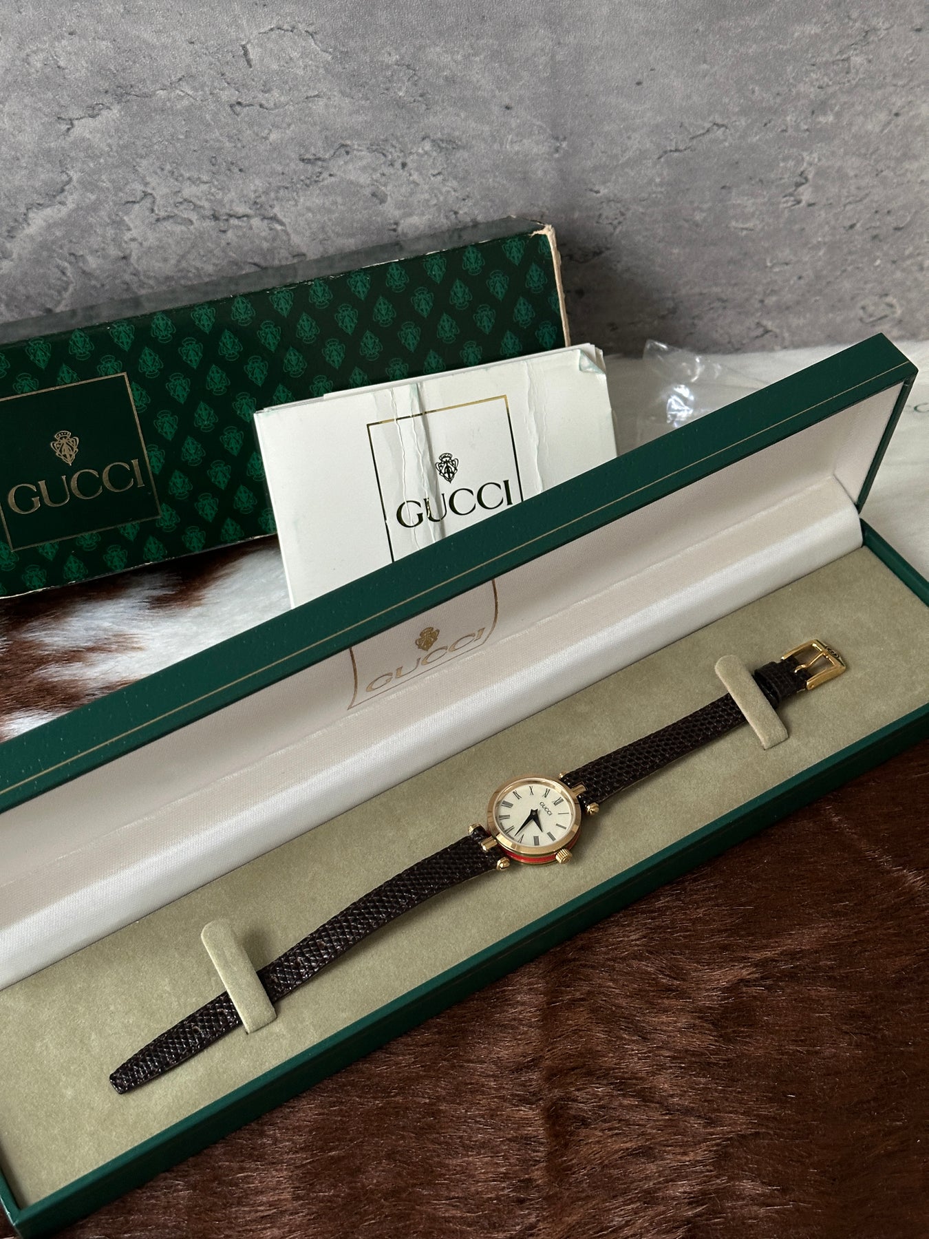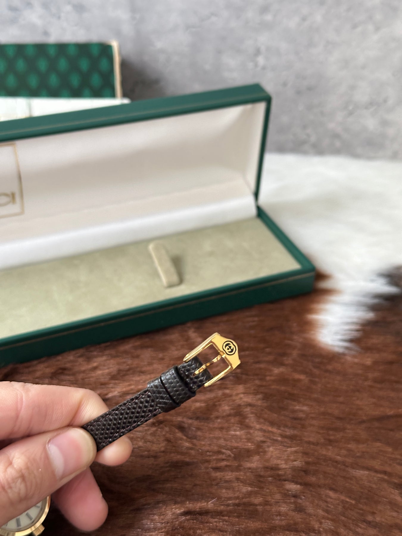 “A lizard leather Gucci watch with the stripe side detail AND in full set? That’s vintage gold. So classy, so elegant — don’t let this one slip!”