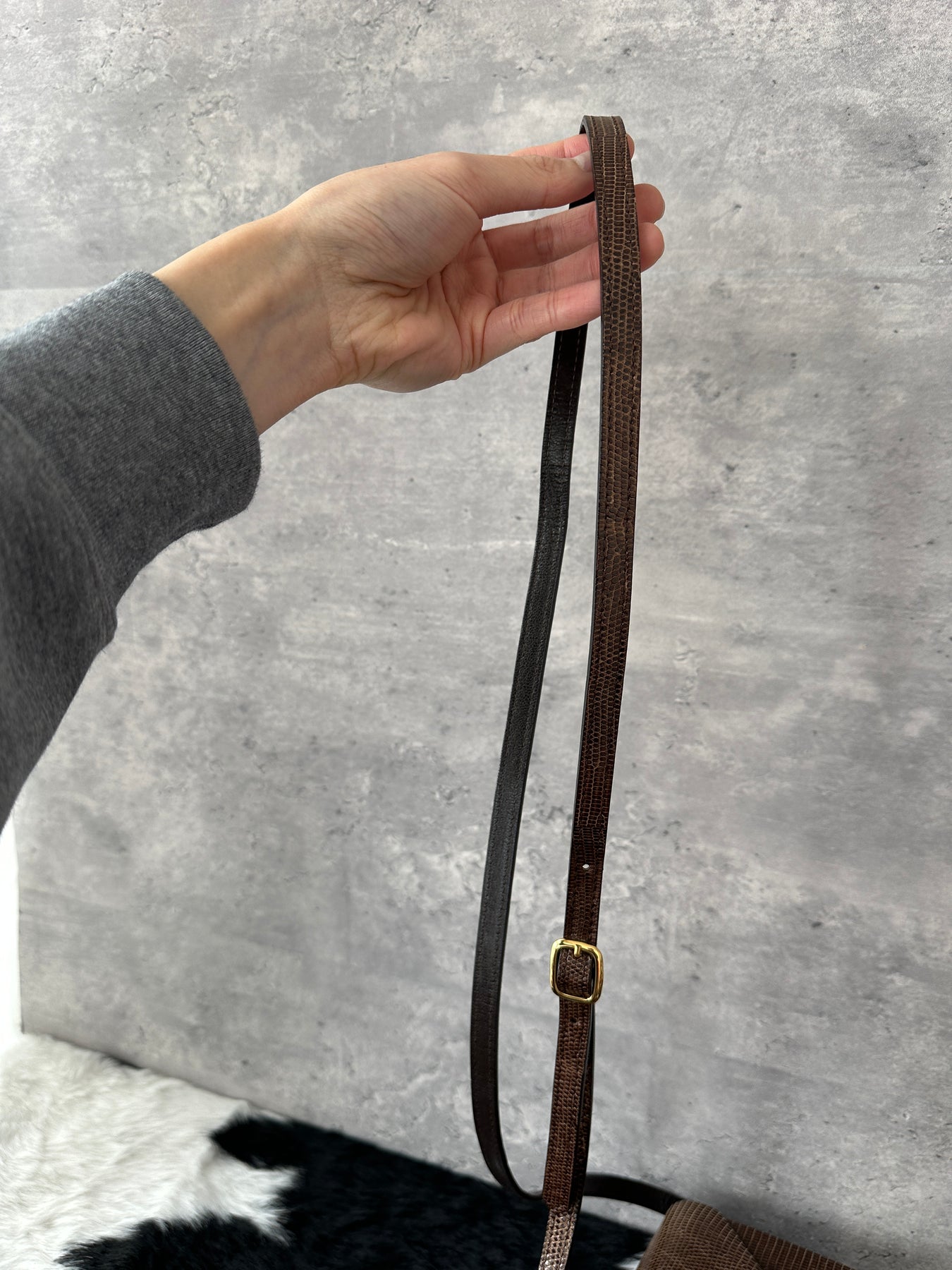 A beautifully preserved Saint Laurent crossbody bag crafted from rare lizard leather, a material only seen in vintage-era pieces. The rich chocolate brown tone enhances the natural scale texture, creating a deep, elegant sheen that is both understated and luxurious.