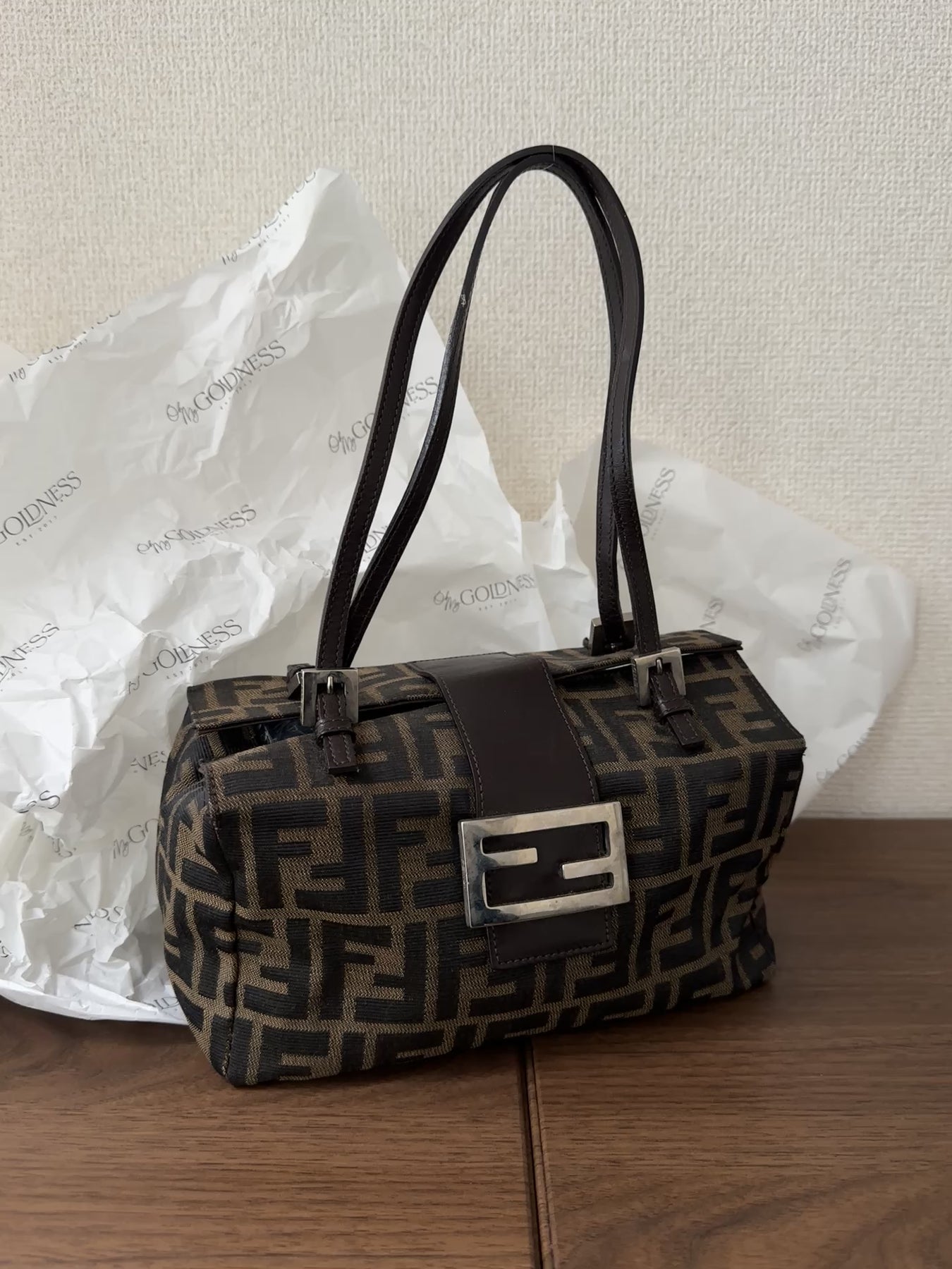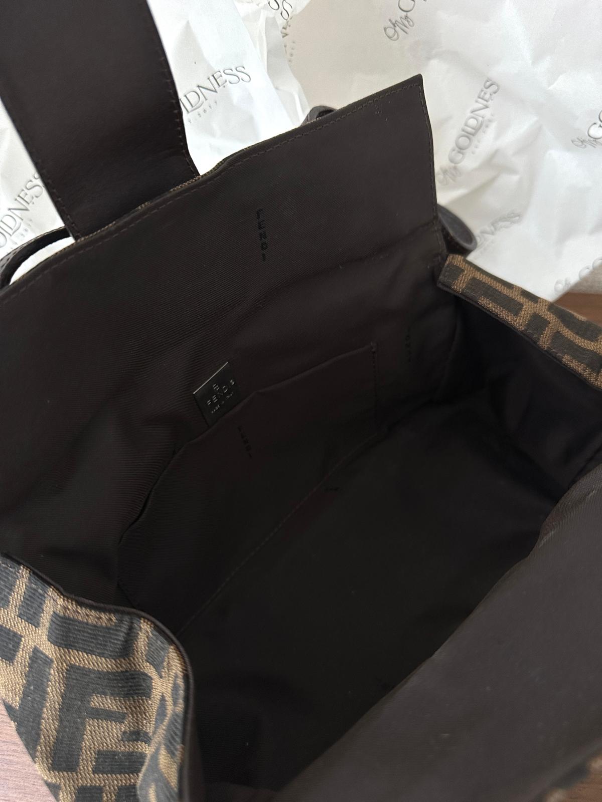 The signature Fendi metal buckle closure on the front adds a touch of bold sophistication, pairing beautifully with the rich brown leather trim. Inside, the space is surprisingly roomy — you can easily fit your essentials like a phone, wallet, and even a small cosmetic pouch. Because of its soft structure, it doesn’t feel rigid or limited when you fill it up, making it ideal for everyday use💕。
