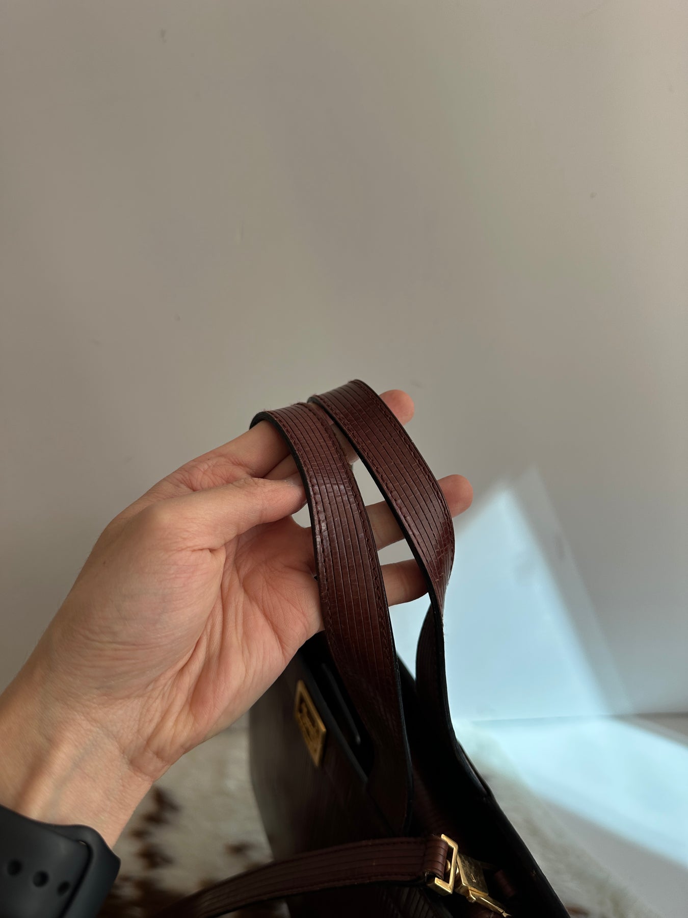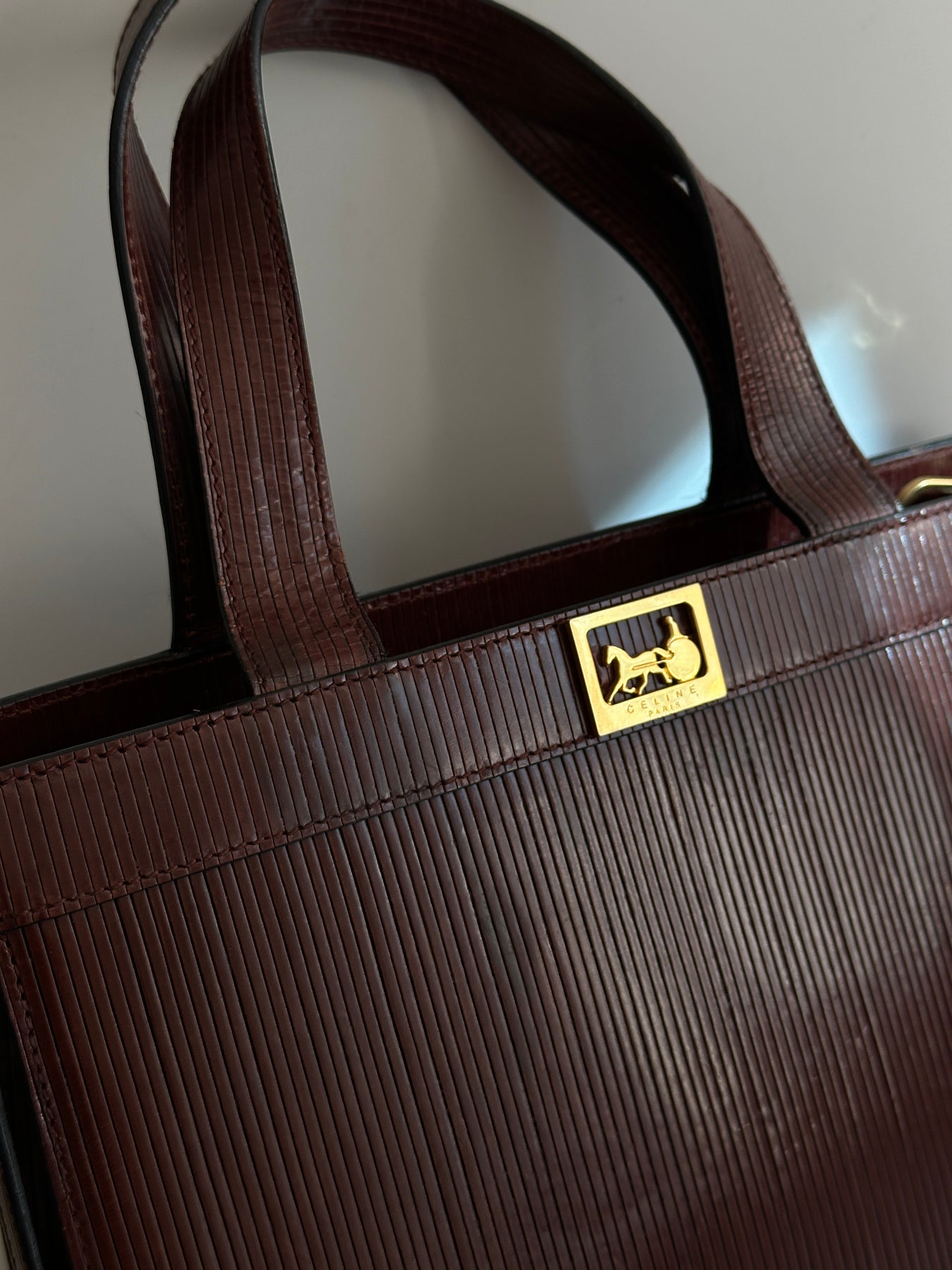 Crafted from deep chocolate-brown textured leather, the bag balances form and function perfectly — structured yet soft to the touch, with a smooth crossbody strap that offers versatility and ease. Every golden accent gleams, a subtle nod to the sophistication of vintage Celine craftsmanship.