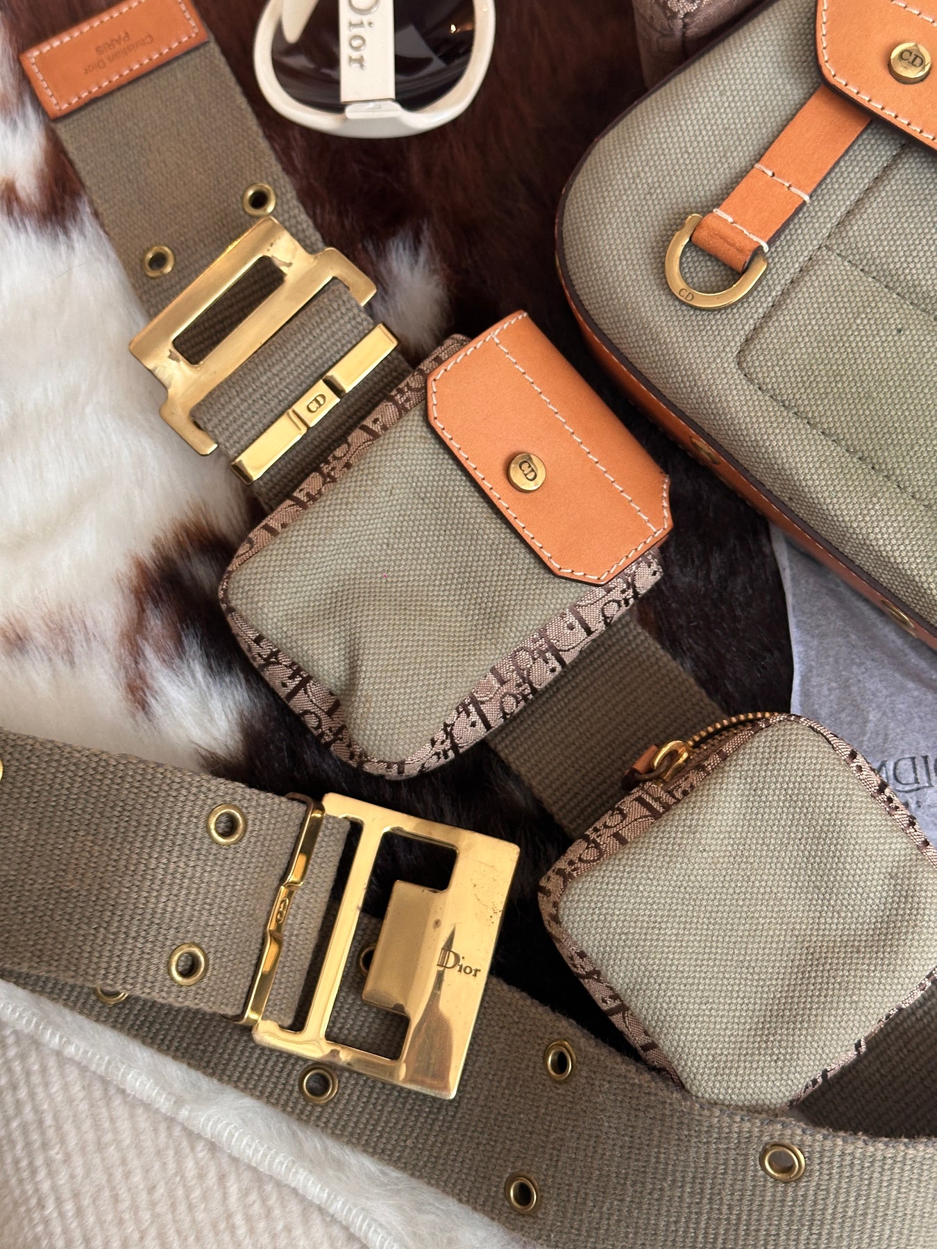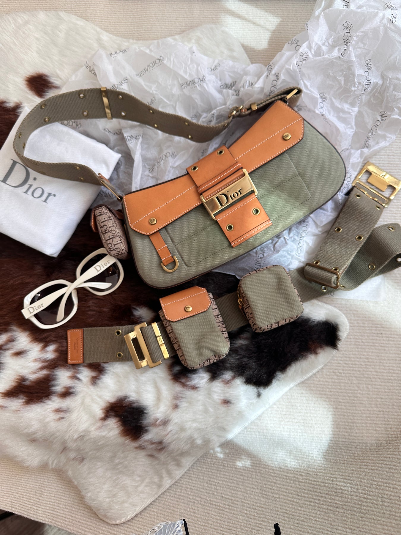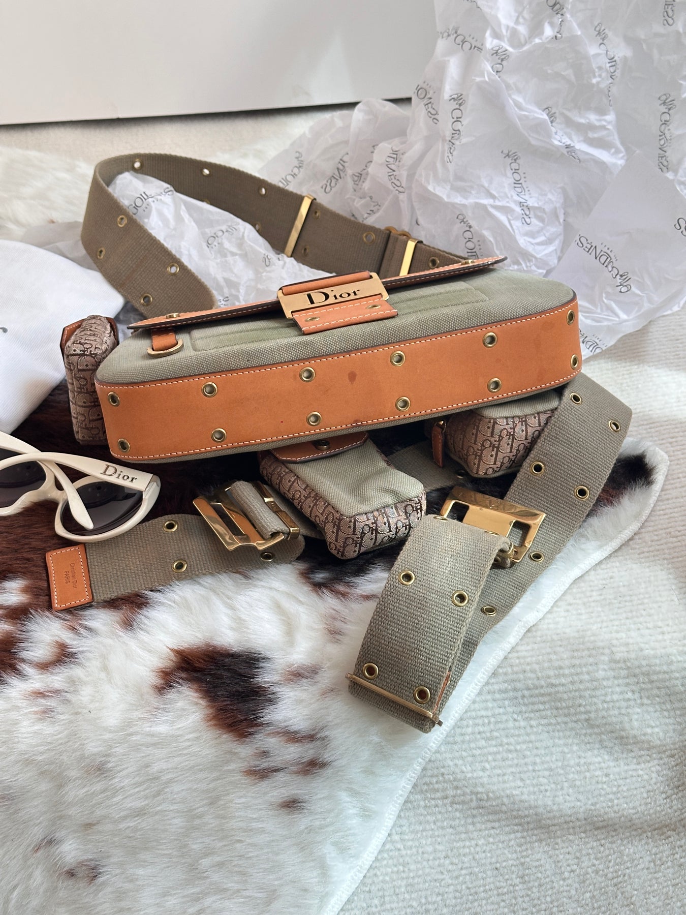 Crafted in khaki canvas with caramel leather trims and bold gold hardware, it channels the rebellious yet refined Dior spirit of the early 2000s. The matching adjustable punk strap and detachable mini pouches bring a utilitarian edge that feels fresh even today.