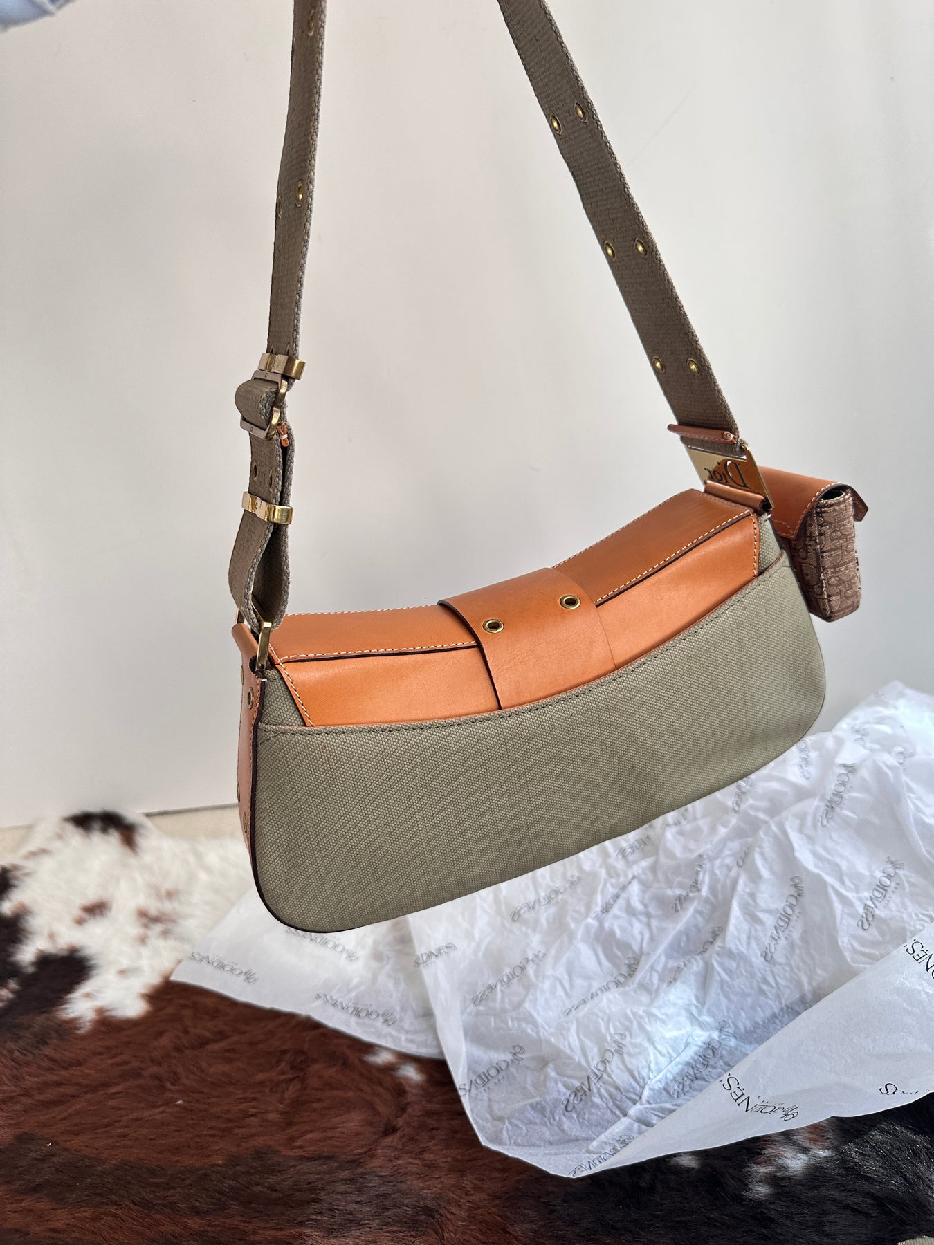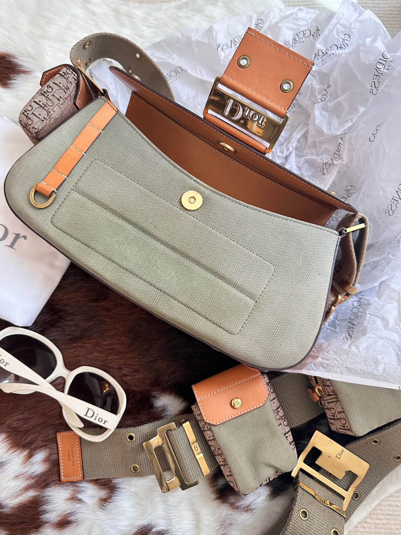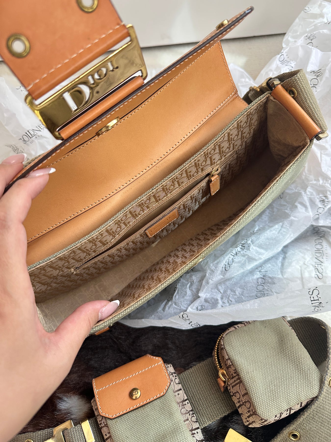 Crafted in khaki canvas with caramel leather trims and bold gold hardware, it channels the rebellious yet refined Dior spirit of the early 2000s. The matching adjustable punk strap and detachable mini pouches bring a utilitarian edge that feels fresh even today.