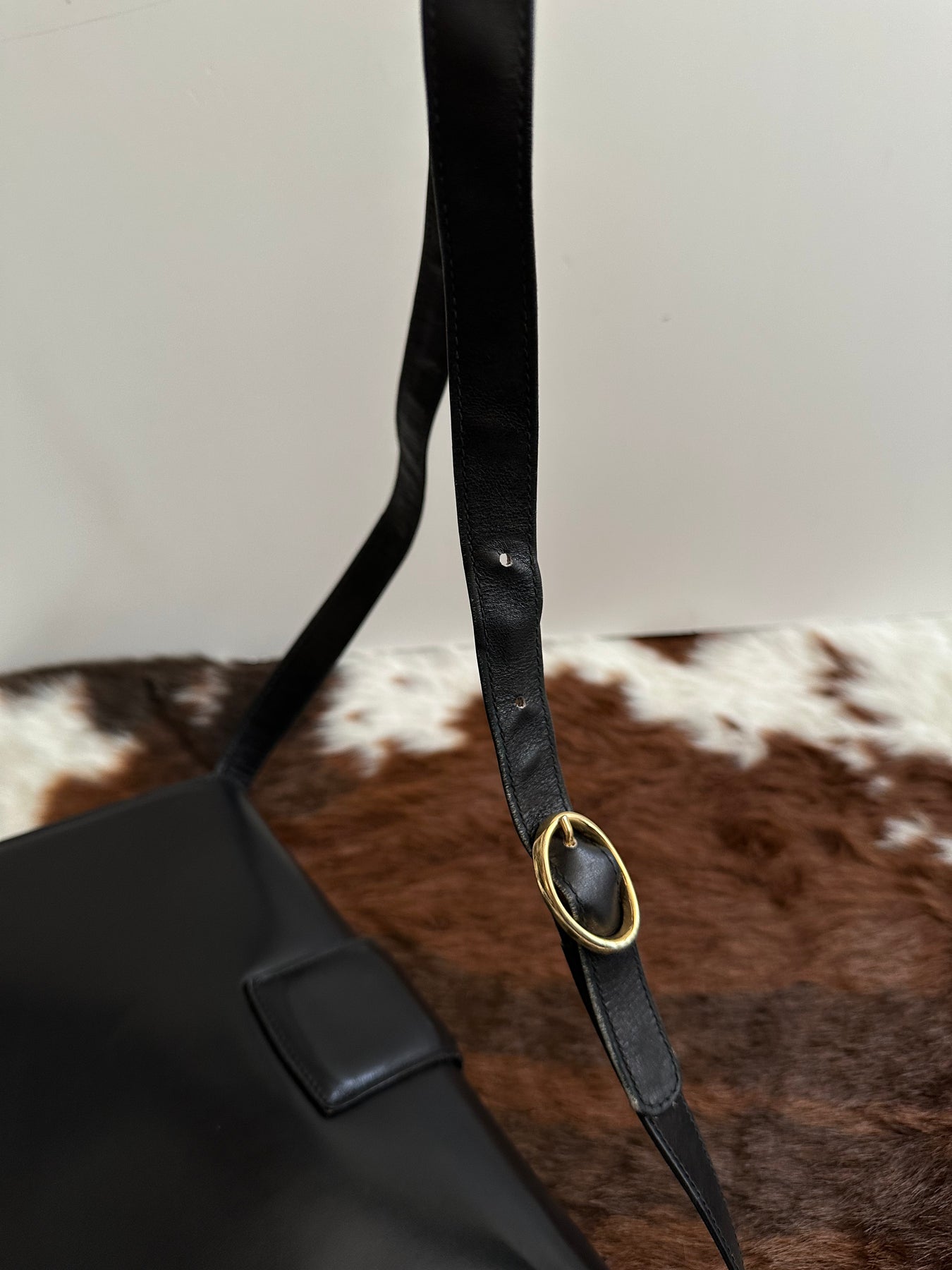 Crafted in smooth black calfskin with a beautifully sculpted silhouette, it’s adorned with the signature gold horse carriage buckle — a symbol of motion, grace, and refinement. The structured design gives it a polished, almost architectural presence, while the subtle curves keep it effortlessly feminine.