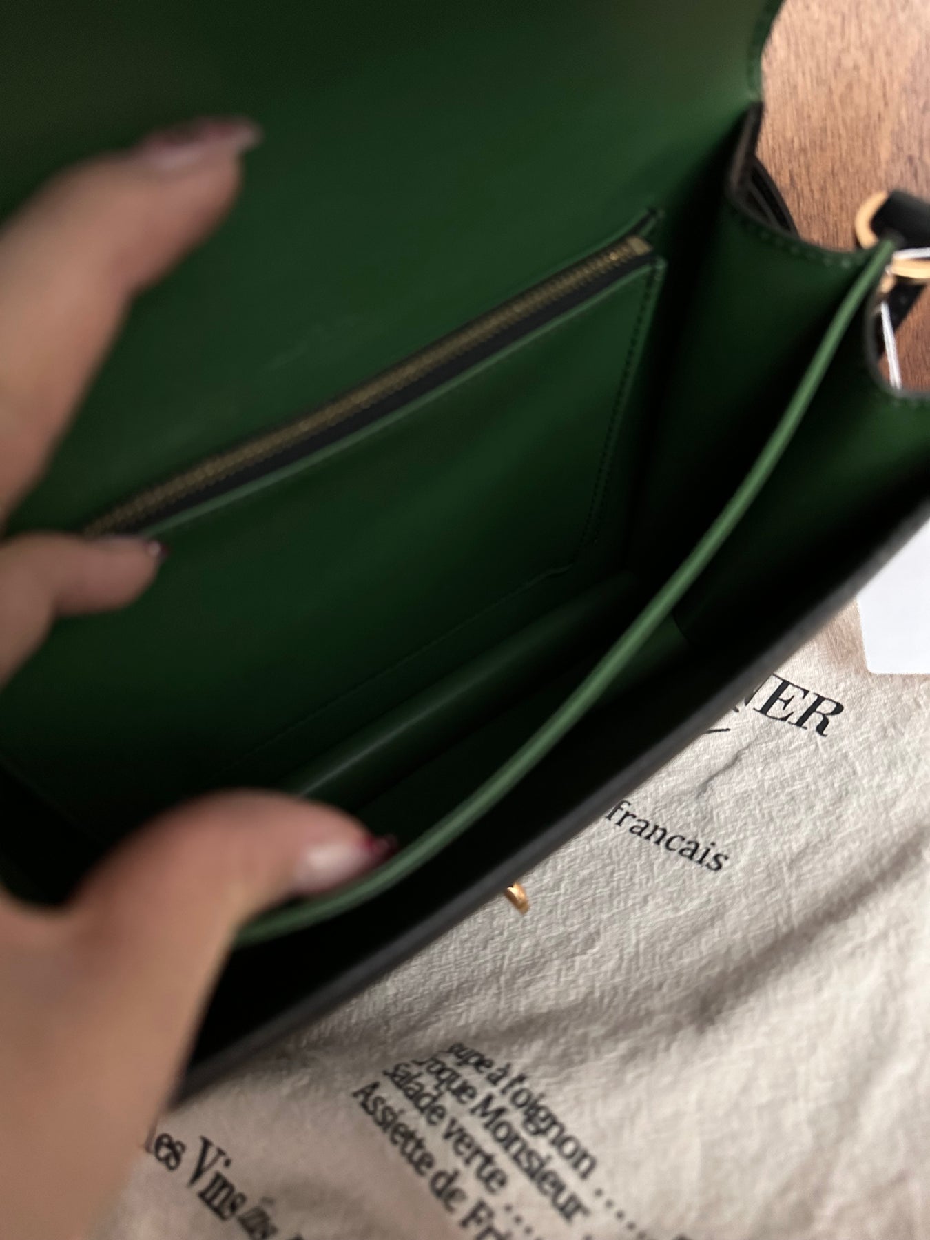 The black and green contrast is stunning, and the circular turn-lock detail makes this bag truly special. Easy to style and perfect for everyday wear.